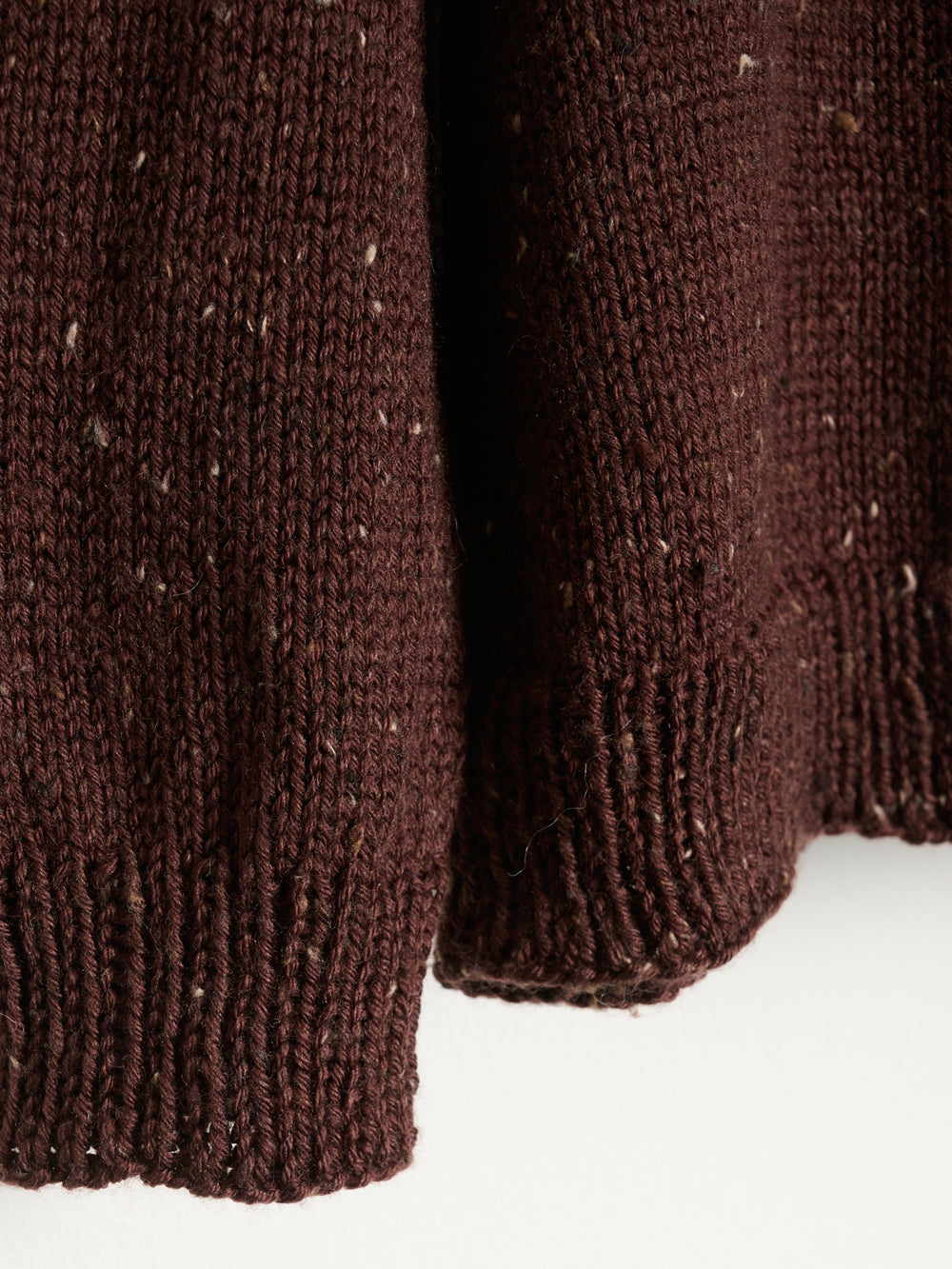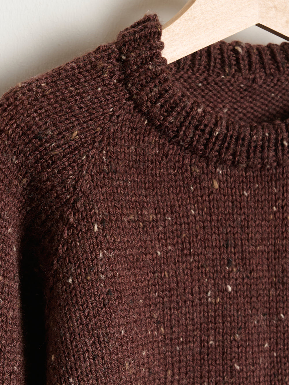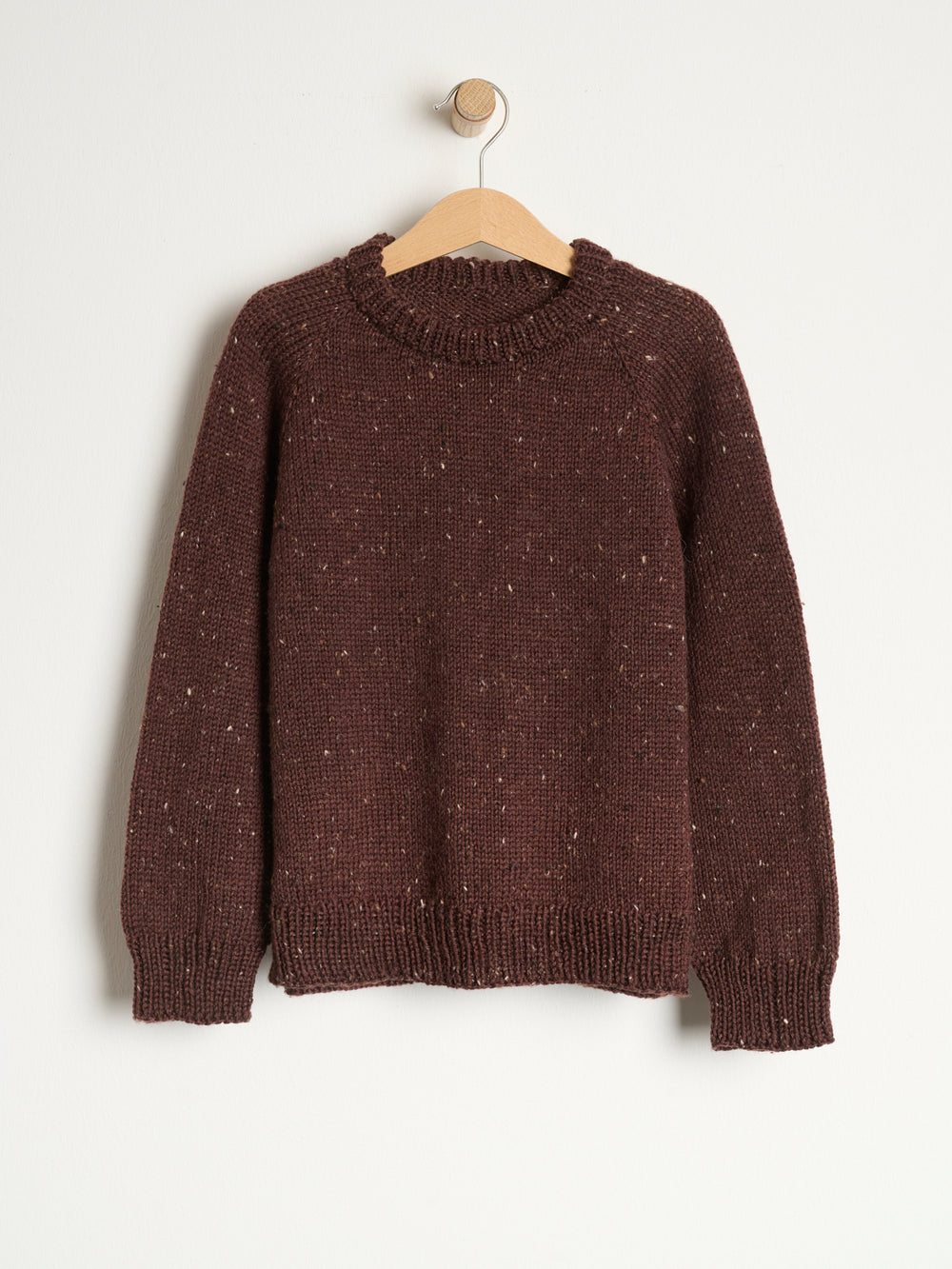 Hanstholm sweater junior strikkes topdown med raglanudtagninger og vendepinde i nakken for bedre pasform. Halskanten strikkes ombukket.