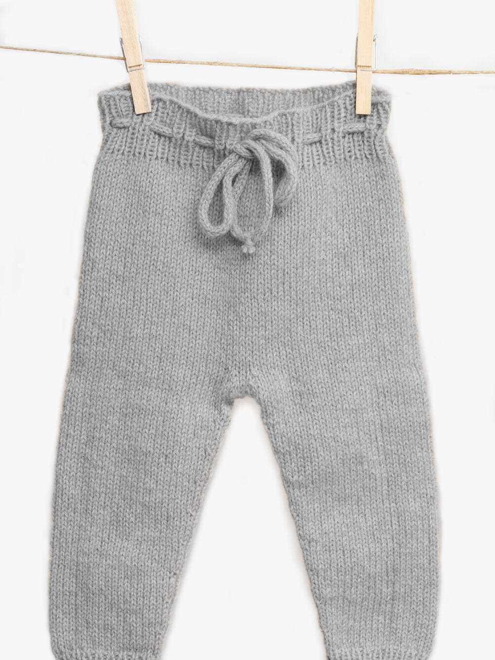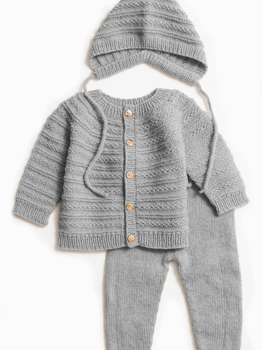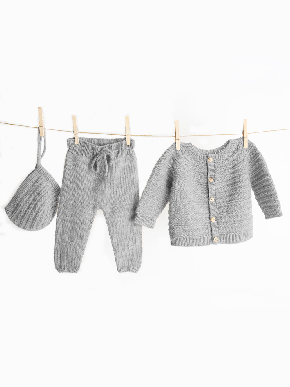Blødt og eksklusivt hentesæt til baby, som består af bukser i glatstrik samt kyse og cardigan med et gennemgående strukturmønster. Kysen er strikket i et dekorativt mønster og lukkes med en i-cord-snor, der holder kysen på plads. Cardiganen strikkes oppefra og ned i strukturmønster med udtagninger i bærestykket og monteres med knapper. Bukserne har en helt enkel konstruktion i glatstrik med ribkanter og hulrække til at trække en i-cord-snor igennem.