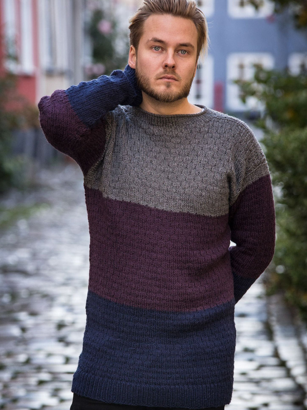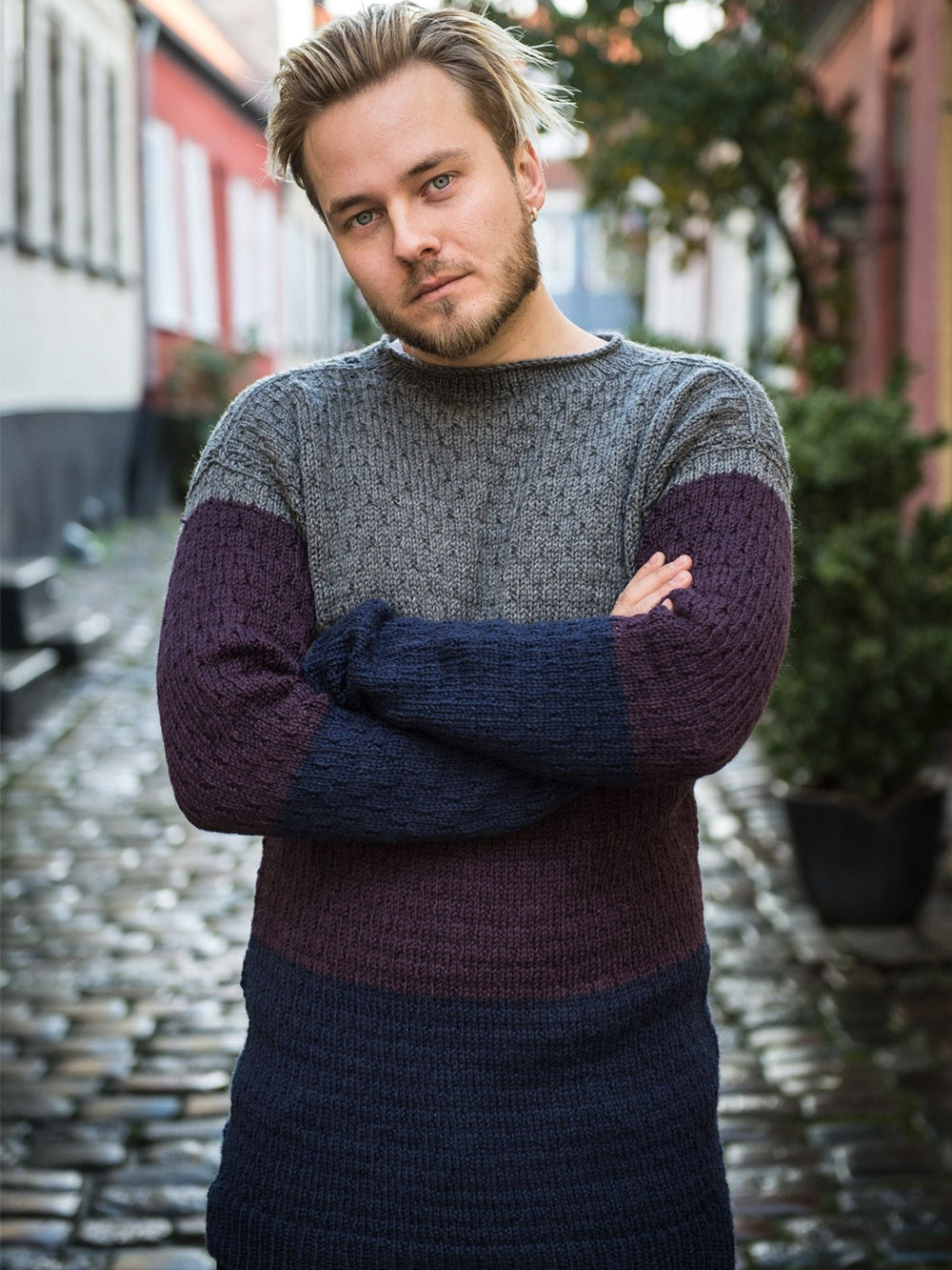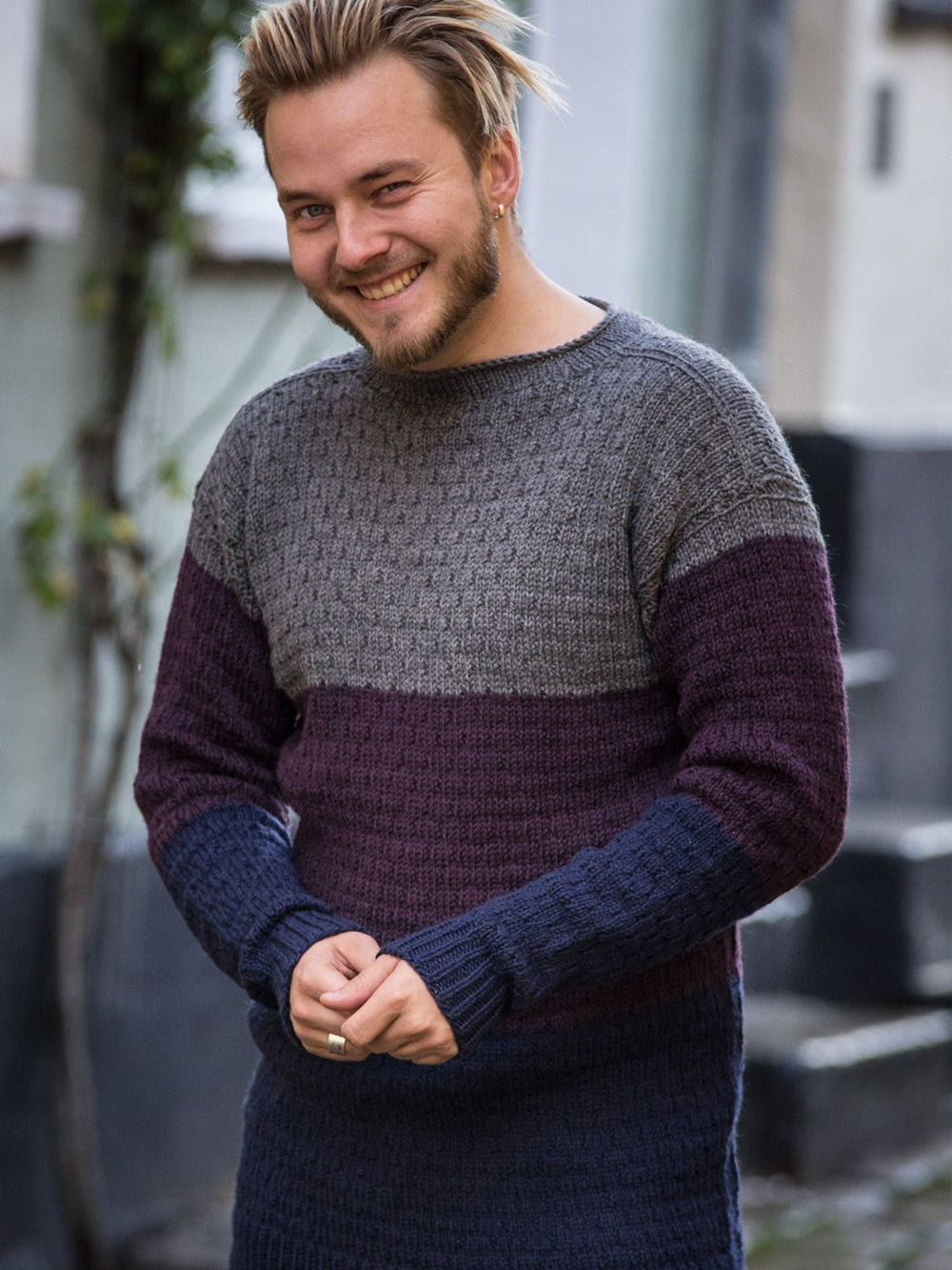 Fyldig herresweater i strukturmønster og forskellige farver, som strikkes nedefra og op.
