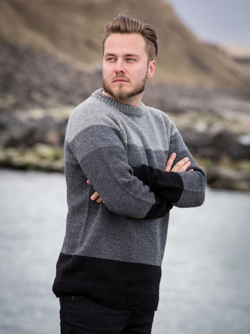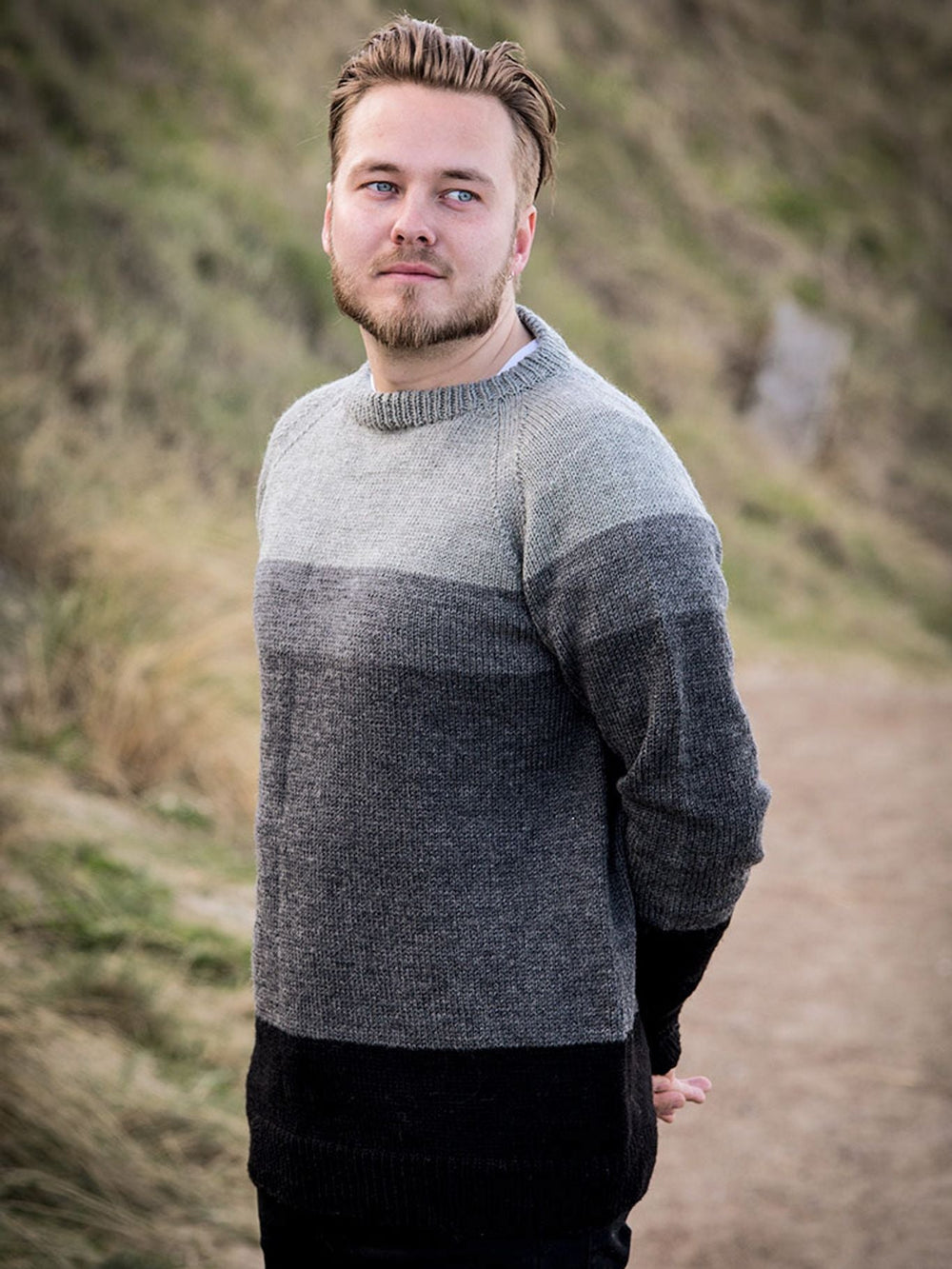 Lækker og lun herresweater, som strikkes nedefra og op. Denne model er strikket i striber, ligesom sweateren også vil være flot i en ensfarvet model.