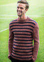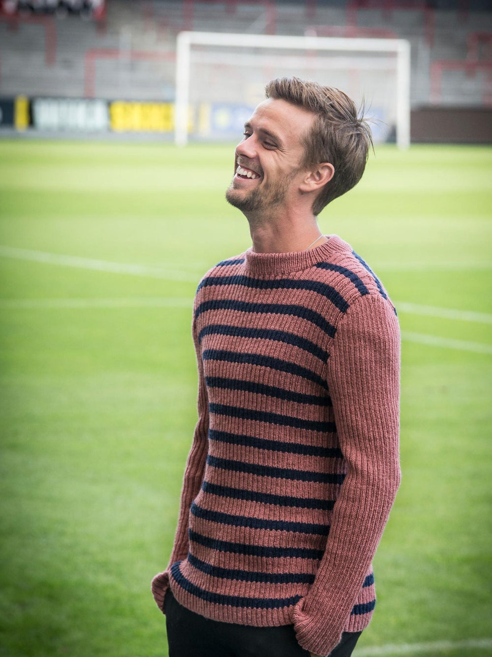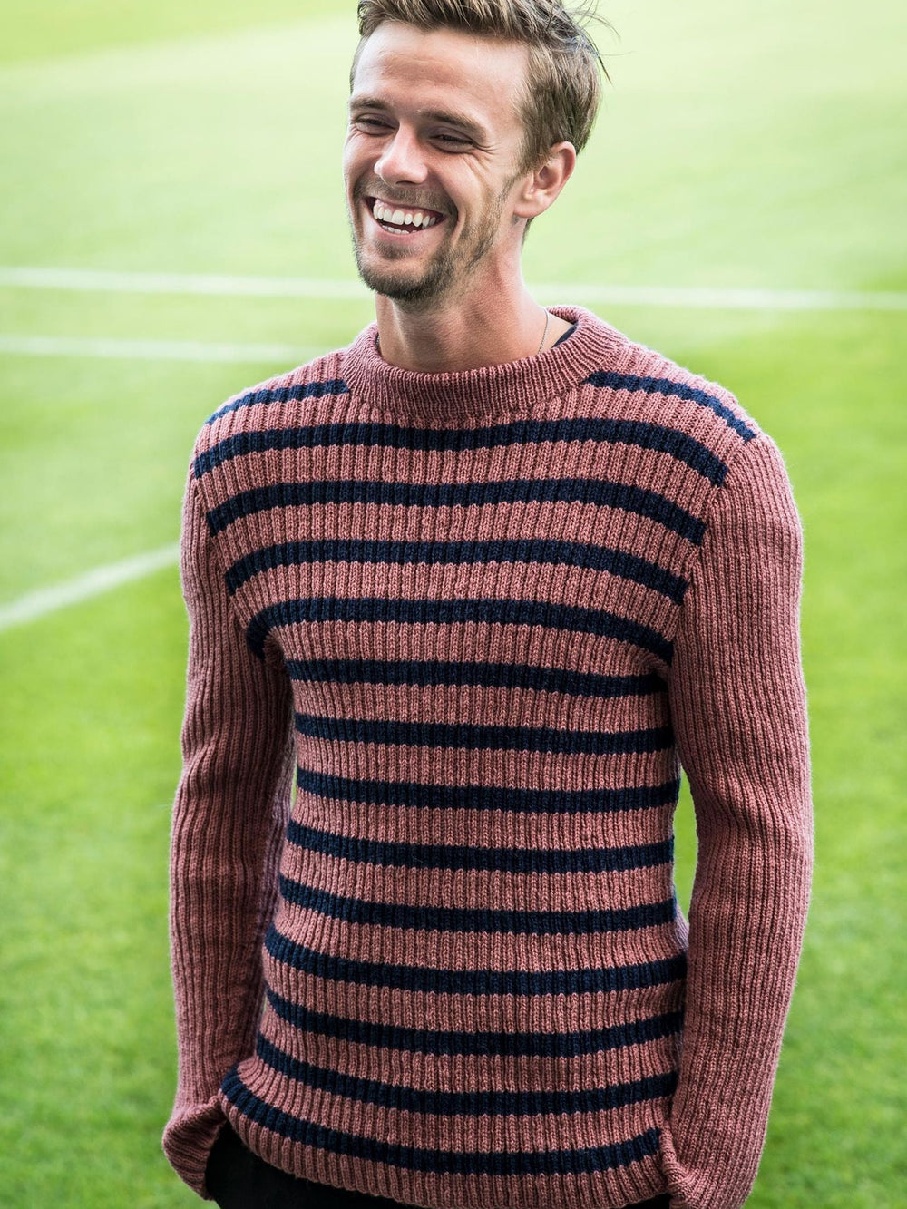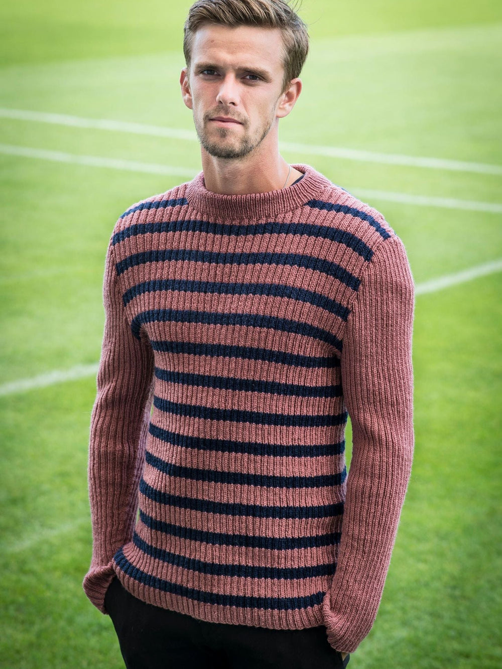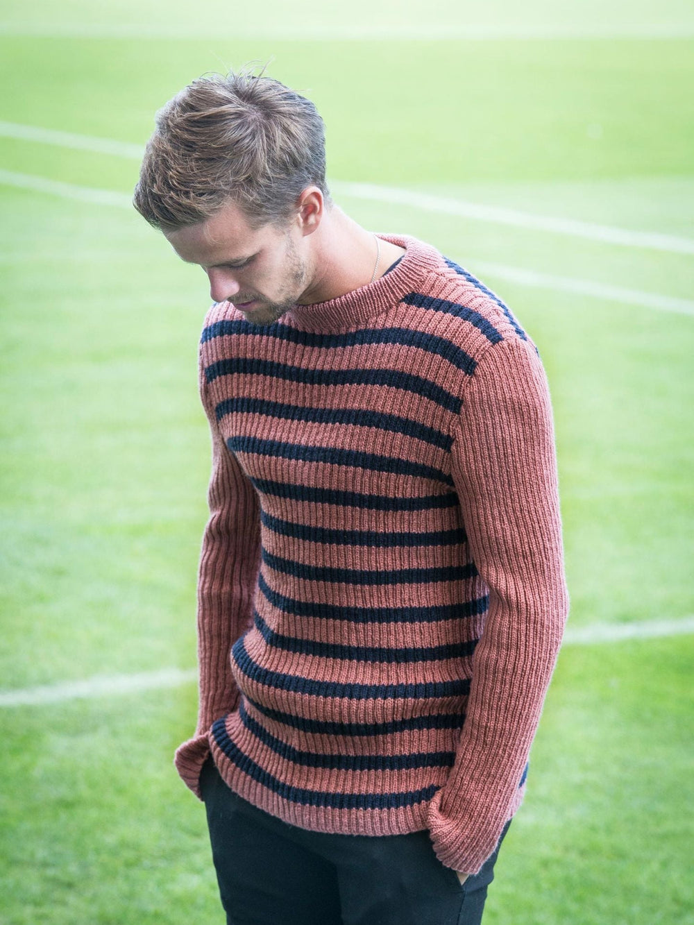 Fantastisk blød og lækker herresweater med striber i gammelrosa og marineblå med påsatte ærmer. Sweateren strikkes nedefra og op til ærmegabet, hvor for- og bagstykke strikkes videre for sig. Sweateren har striber på for- og bagstykke, som skiftevis har forskellig tykkelse. Grundfarven er i tykkere striber, ligesom det også udelukkende er grundfarven, som ærmerne strikkes i.