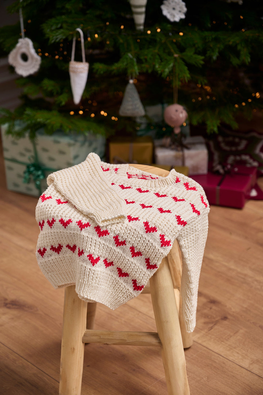 Hjerteblusen strikkes i bomuldsblandingen Mayflower Alliance, hvilket giver en blød bluse, som kan bruges hele året rundt - også som juletrøje.