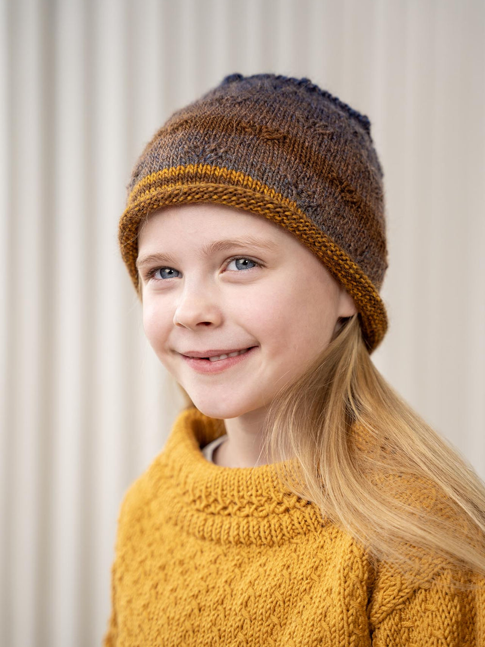 Huen har et flot og stribet farveudtryk, da den strikkes i Mayflower Taormina. Den bløde alpakablanding har én lang mønsterrapport i forskellige farver, som er nøje afstemt til hinanden. Garnet er derfor både virkelig blødt og utrolig smukt, da de skiftende farver giver et flot resultat. Alpakagarnet er lunt og blødt, og barnet vil elske at bruge denne hue.