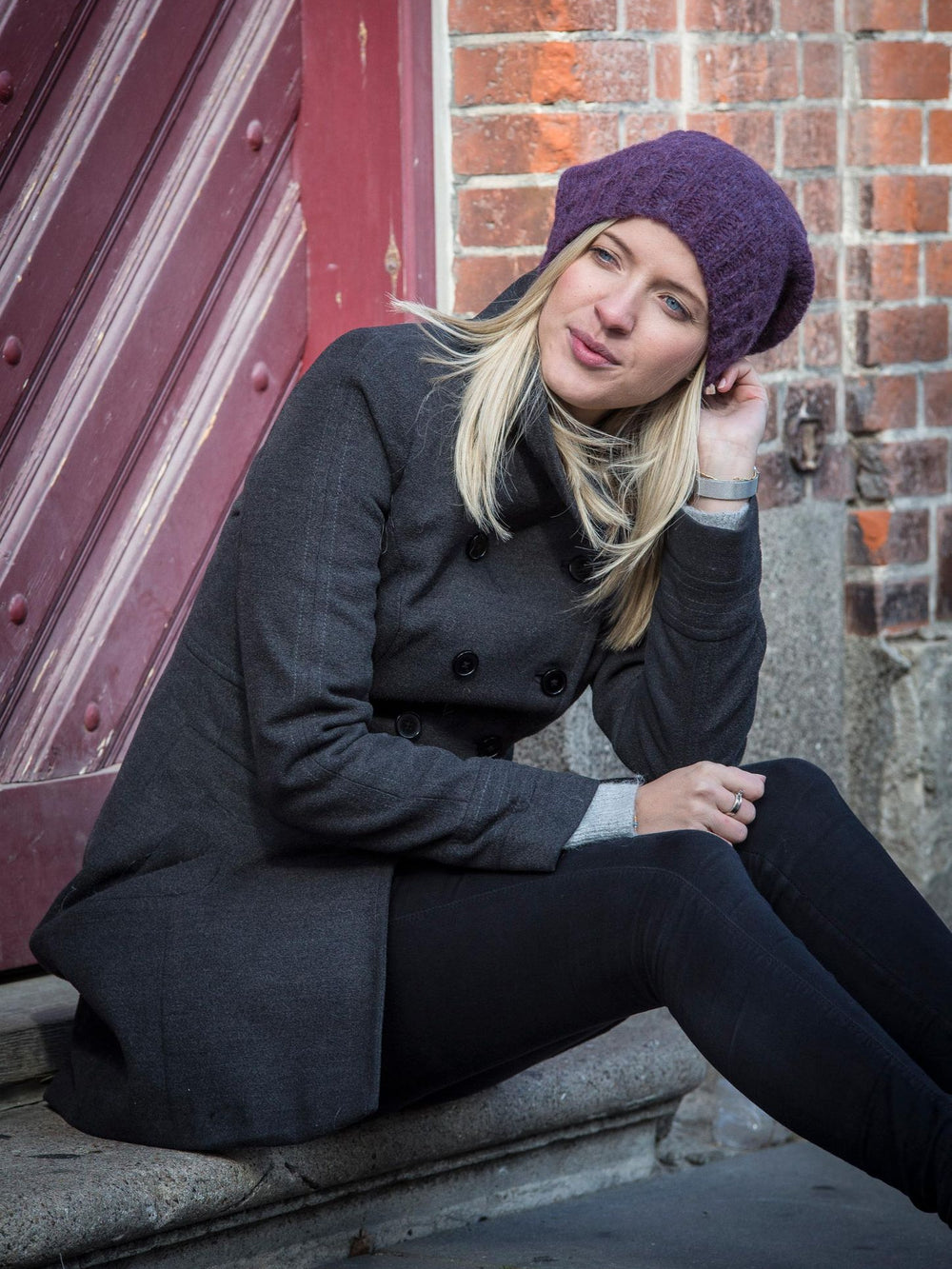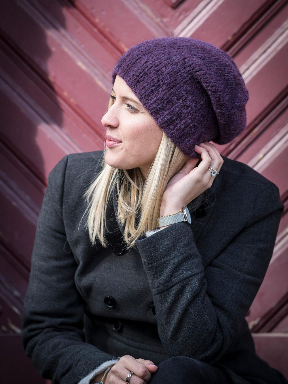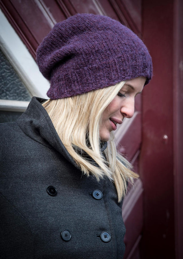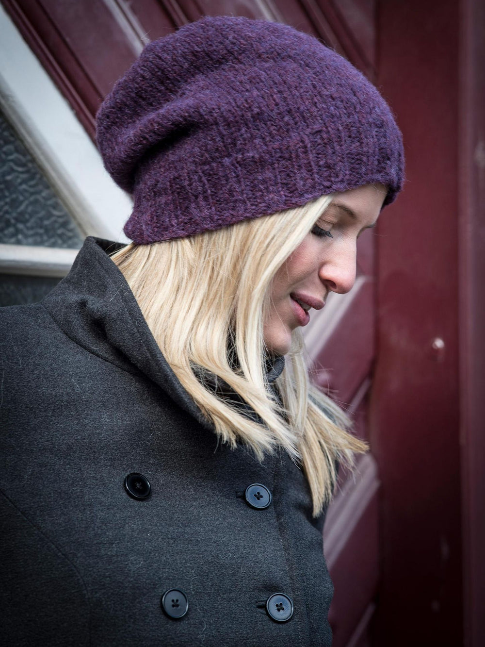 Denne strikkede posehue er designet i det ultrabløde og lette Mayflower New Sky, som er en garnkvalitet, der består af 42% alpaka, 42% uld og 16% polyamid.