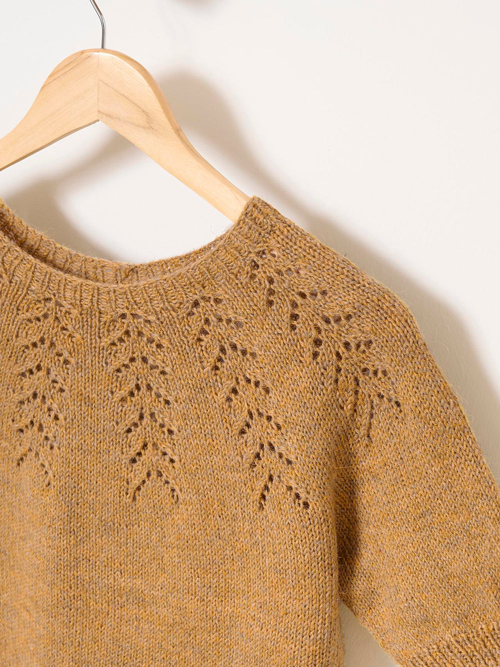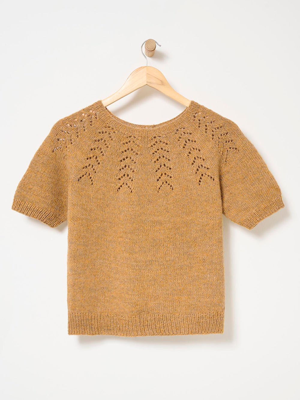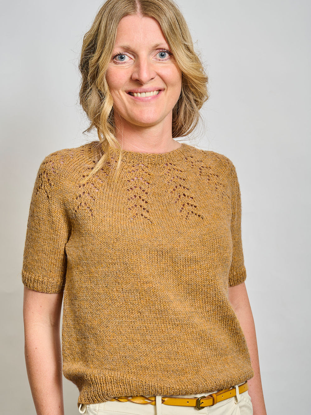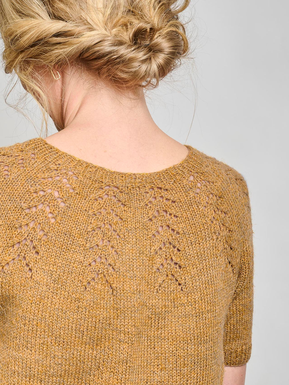 io tee har et virkelig fint hulmønster i bærestykket, og blusen strikkes oppefra og ned i glatstrik og med ribstrikkede kanter. Hulmønsteret laves med simple strikketeknikker efter opskriftens diagram. De korte ærmer gør designet til et forholdsvis hurtigt projekt at strikke, ligesom diagrammet og mønsteret er nemt at gå til.