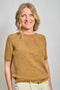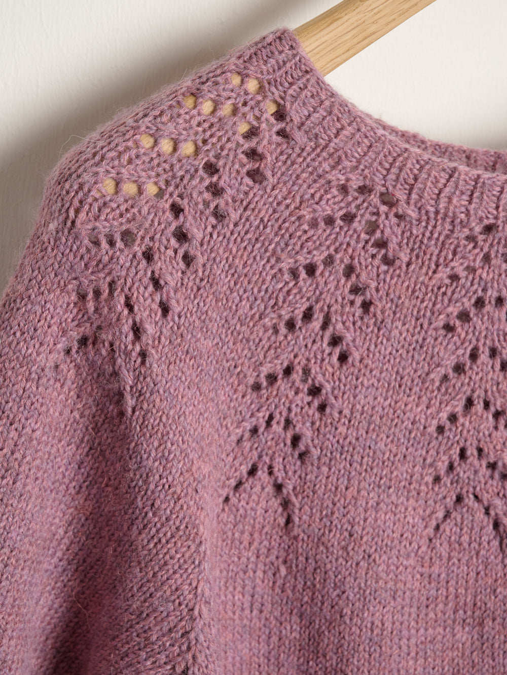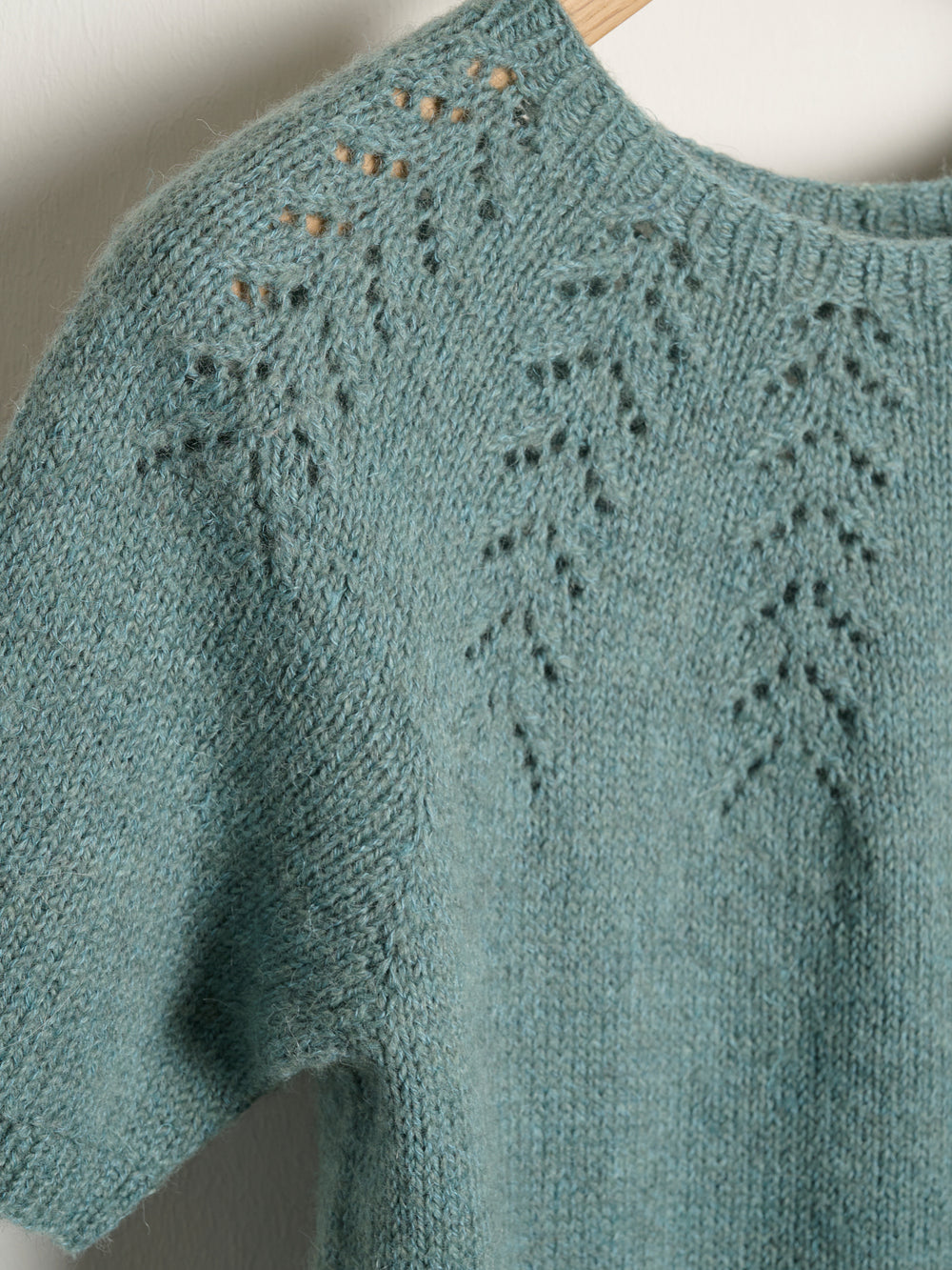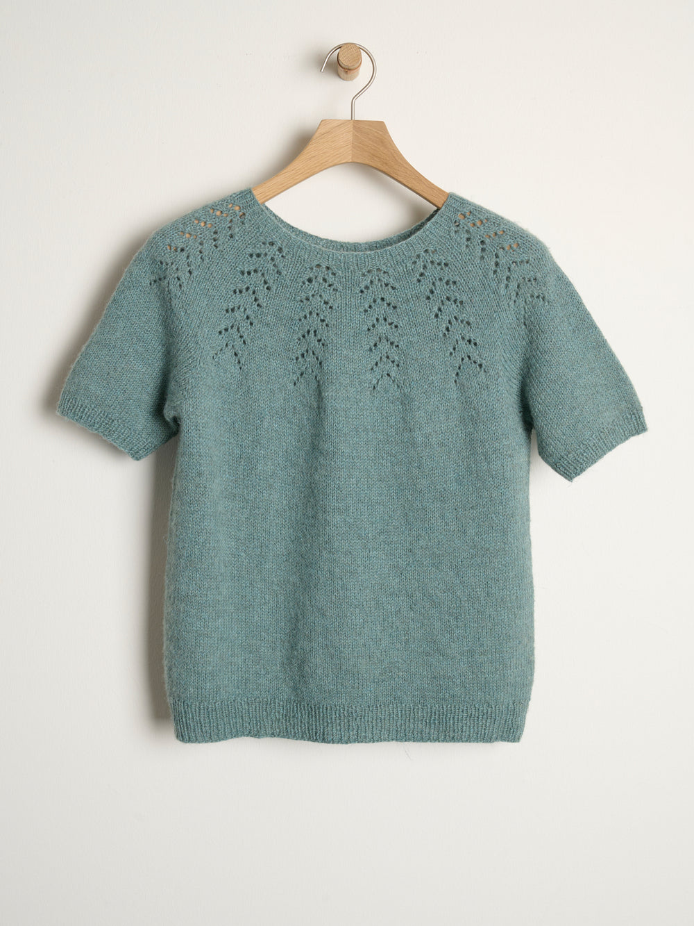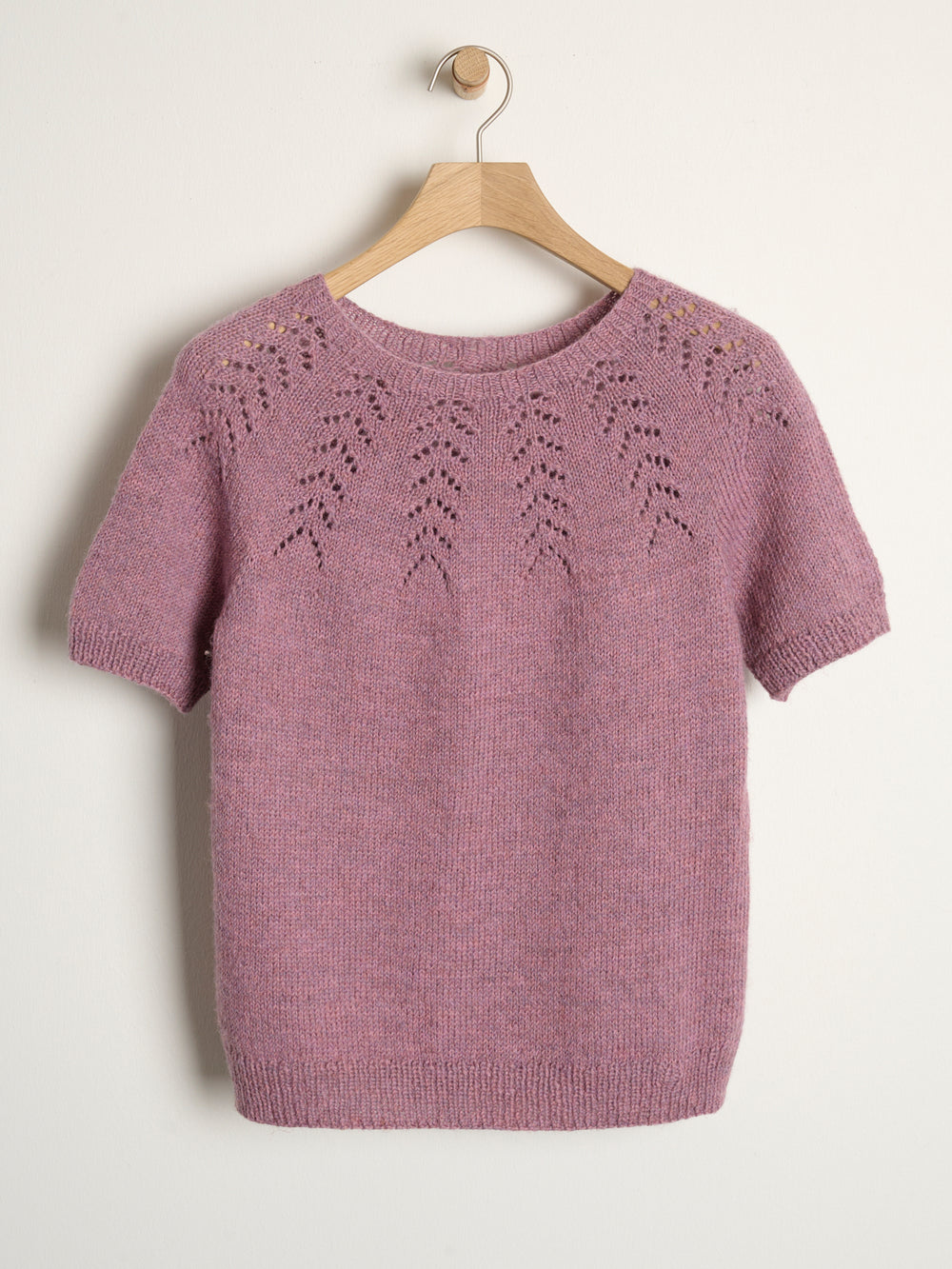 io tee har et virkelig fint hulmønster i bærestykket, og blusen strikkes oppefra og ned i glatstrik og med ribstrikkede kanter. Hulmønsteret laves med simple strikketeknikker efter opskriftens diagram. De korte ærmer gør designet til et forholdsvis hurtigt projekt at strikke, ligesom diagrammet og mønsteret er nemt at gå til.