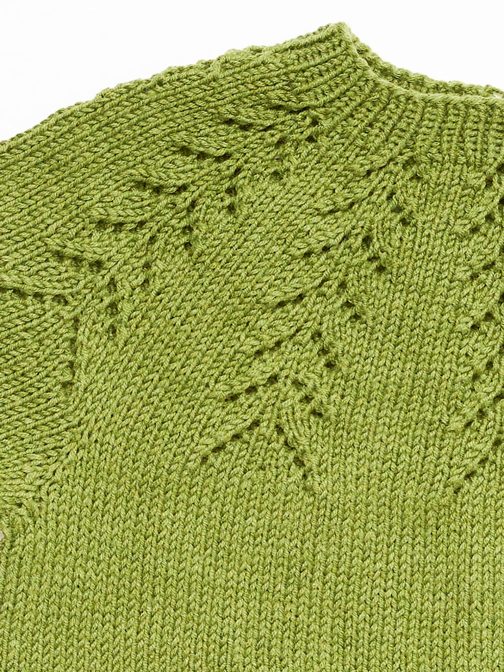 Blusen strikkes top-down efter diagram med et minimum af montering. Designet har et dekorativt hulmønster i bærestykket og strikkes derudover i glatstrik.