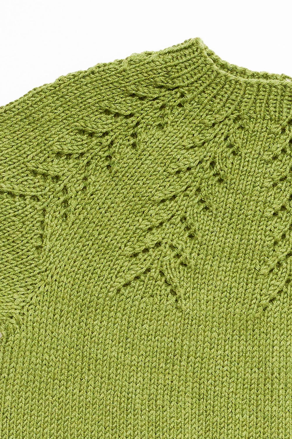 Blusen strikkes top-down efter diagram med et minimum af montering. Designet har et dekorativt hulmønster i bærestykket og strikkes derudover i glatstrik.