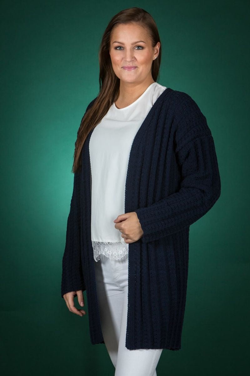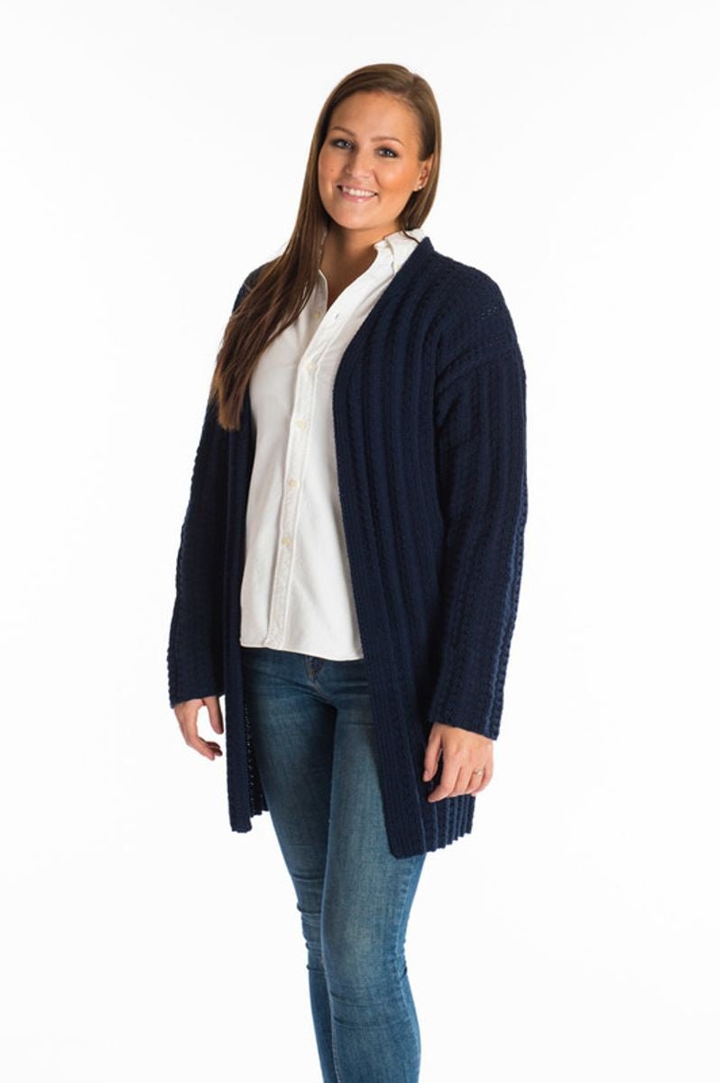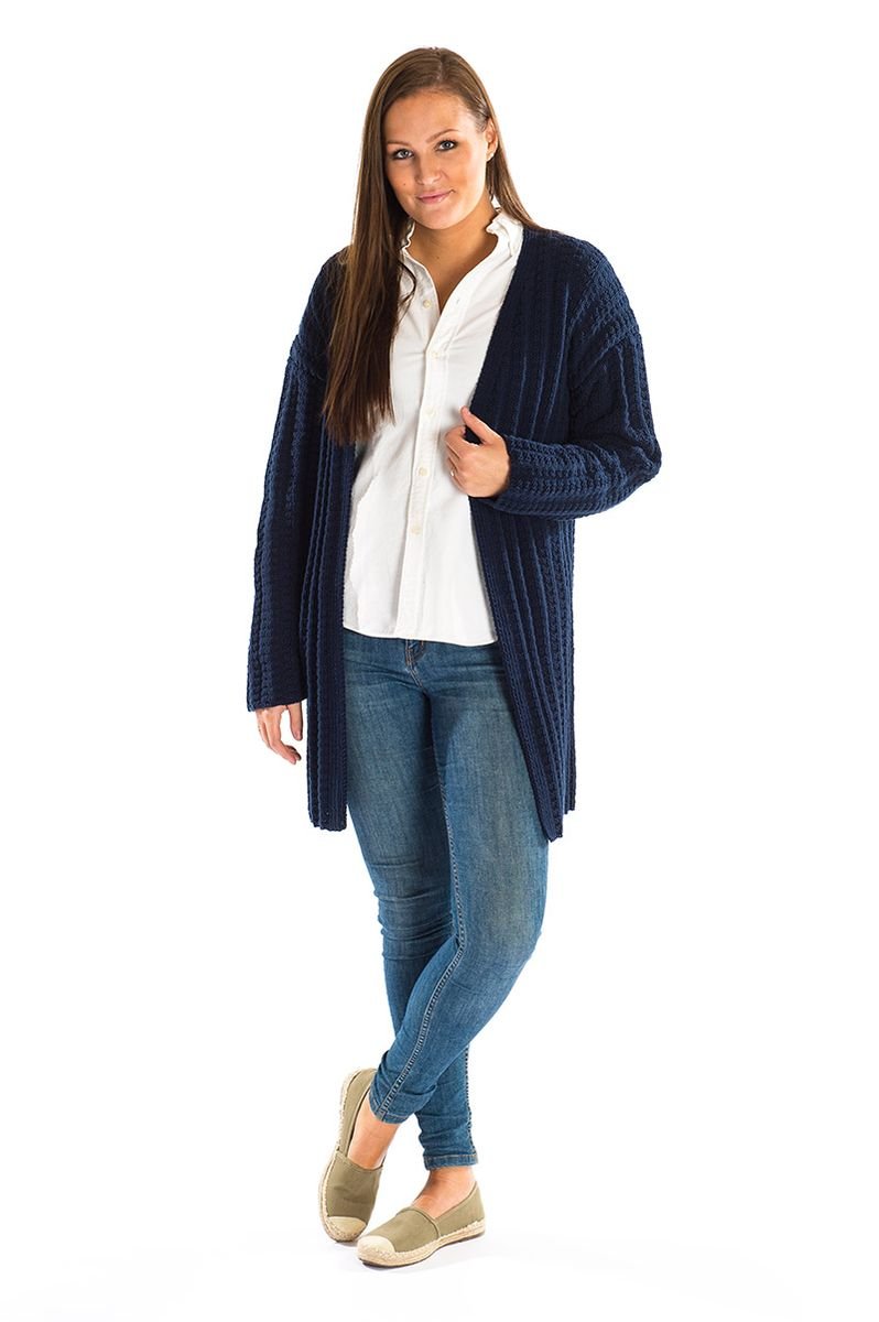 Elegant og lækker lang cardigan strikket i den superbløde kvalitet fra Mayflower kaldet Mayflower Cotton 2. Mayflower Cotton 2 er den mellemste tykkelse garn i serien fra Mayflower Cotton 1 - 2 - 3. Den består af 50% bomuld og 50% Hb acryl, begge af bedste kvalitet.