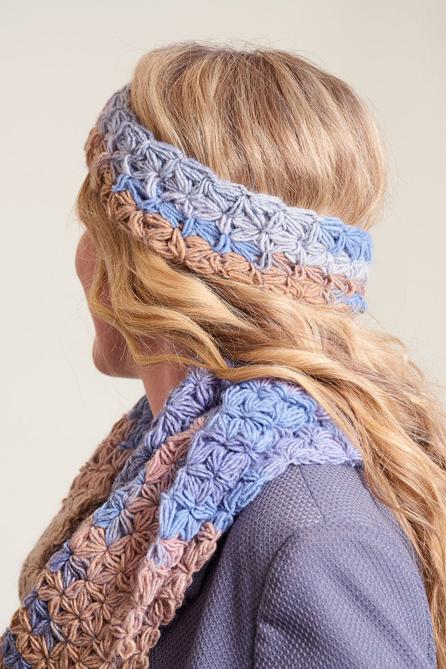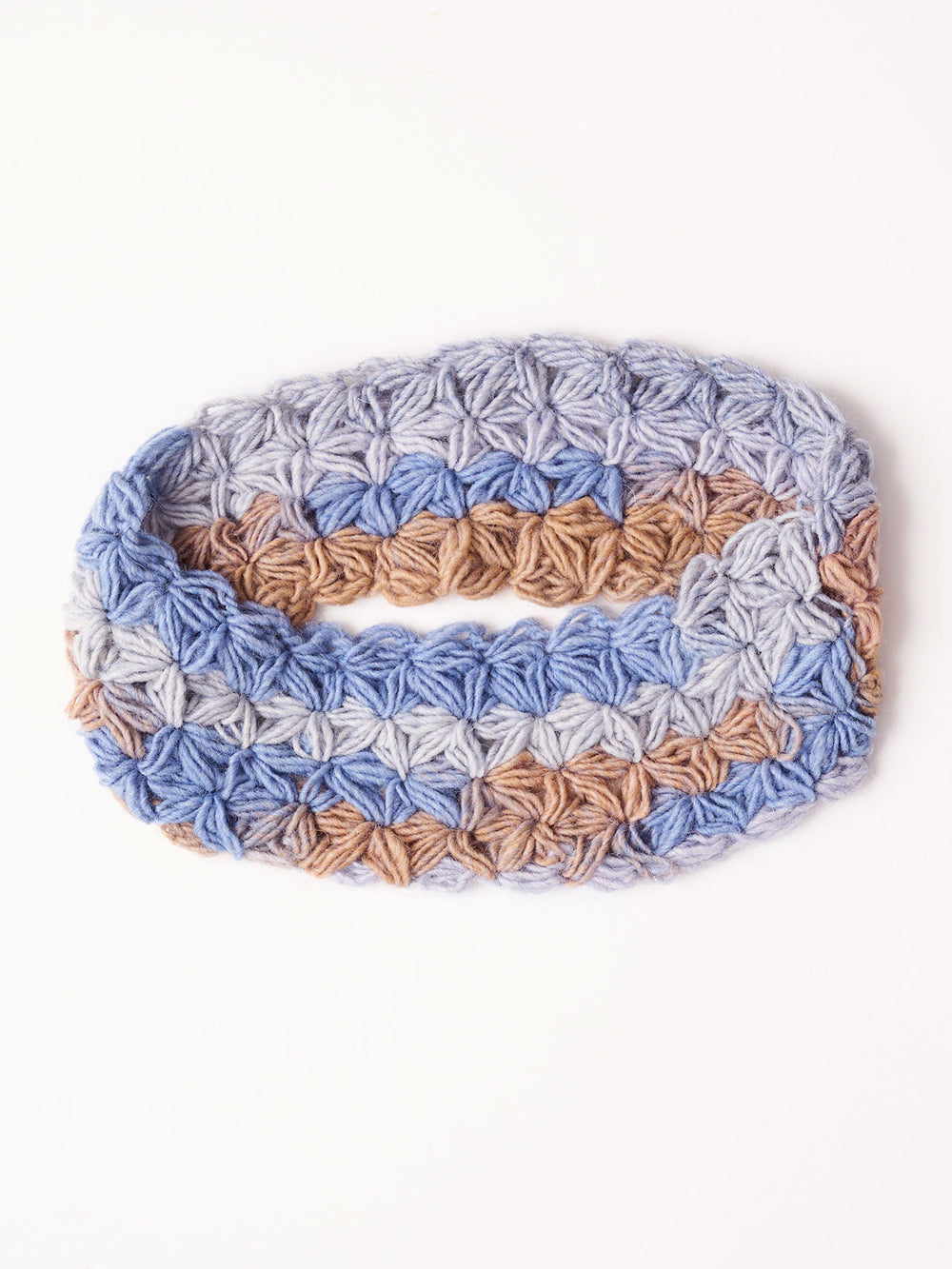 Pandebåndet hækles i Mayflower Taormina, som er et blødt og uldent garn, da det bl.a. er spundet på alpaka. Dit pandebånd bliver derfor enormt behageligt og dejligt at have på. Garnet har et løbende farveskifte med nuancer, der passer godt sammen, og pandebåndet får derfor et flot farveskifte farver, som komplimenterer hinanden.