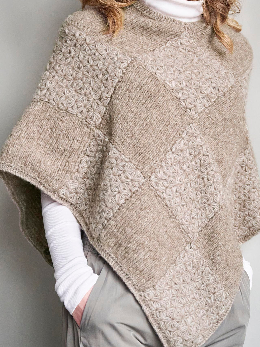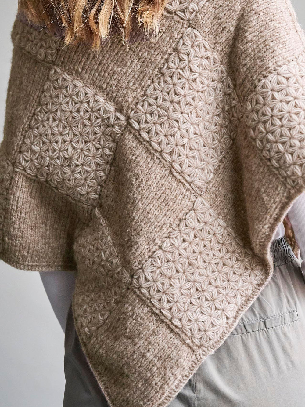 Smuk strikket poncho, som er lavet med kvadrater i henholdsvis glatstrik og hæklet jasminmøsnter.