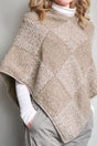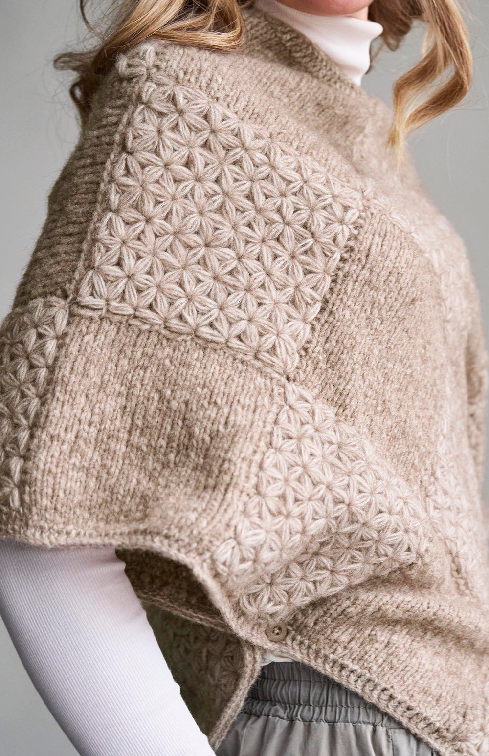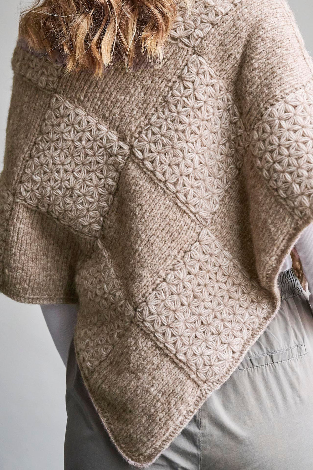 Smuk strikket poncho, som er lavet med kvadrater i henholdsvis glatstrik og hæklet jasminmøsnter.