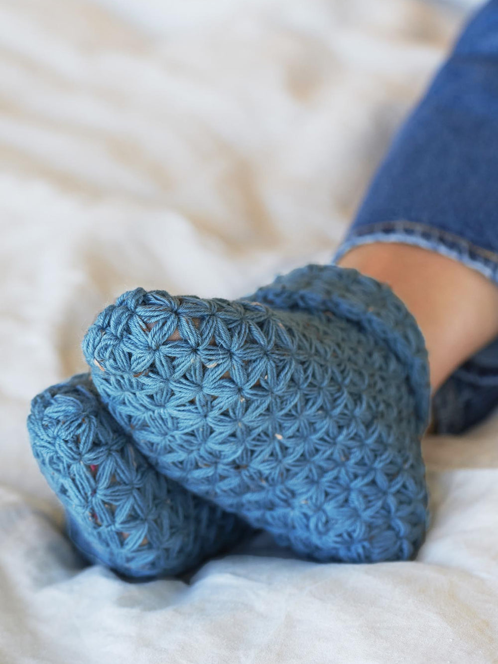 Lækre hjemmesko, som hækles i et blødt, varmt og slidstærkt strømpegarn. Jasminfutterne er designet med et flot blomstermønster, som laves med puffmasker. Puffmaskerne dannes af løkker af garn, der trækkes ud til en jævn længde og afsluttes sammen. Resultatet er virkelig smukt.