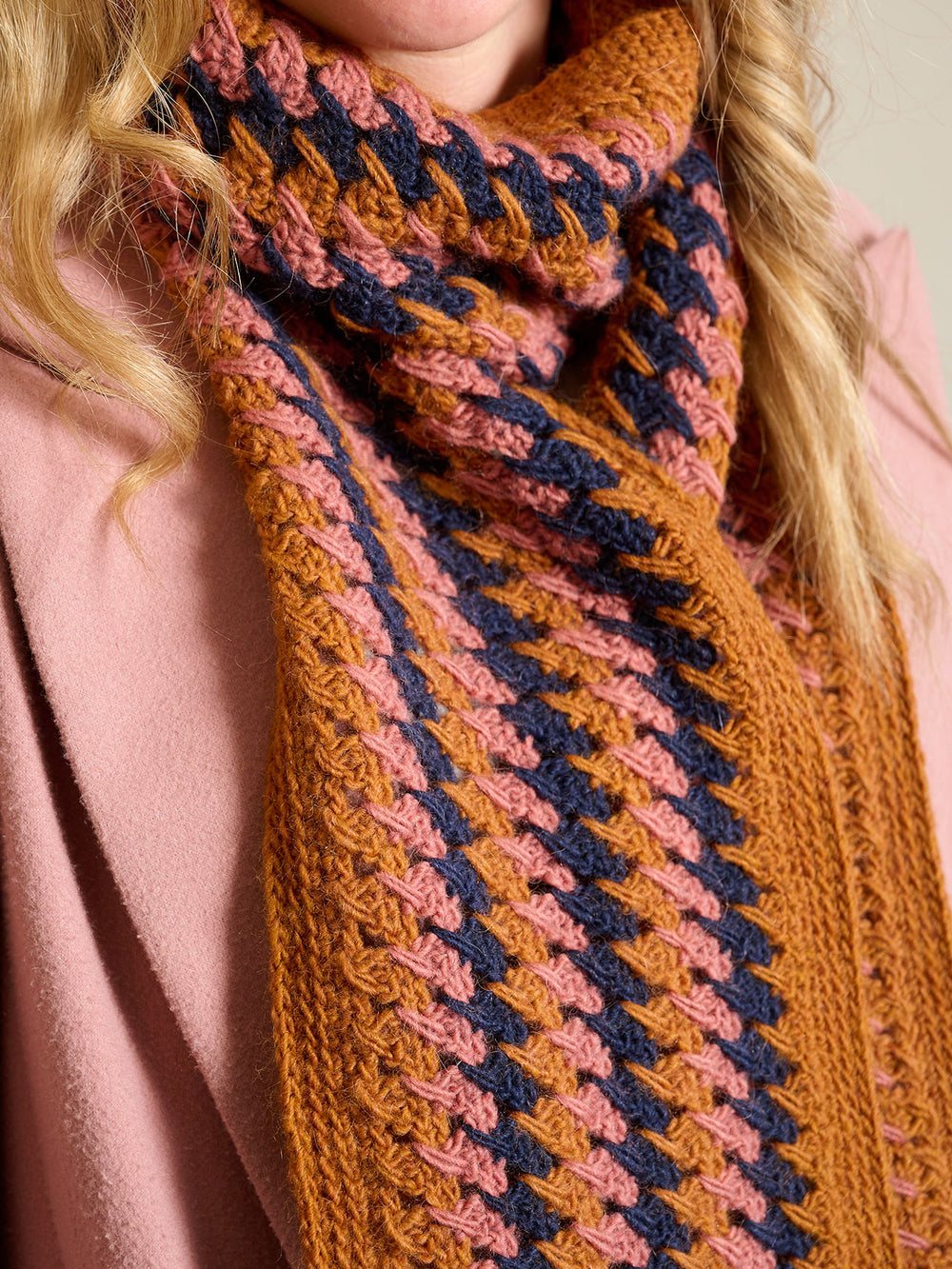 Judith tørklædet hækles i et flot mønster med teknikken judith masker, som lidt minder om flet. Og når tørklædet samtidig hækles med flere forskellige farver, bliver effekten endnu bedre.