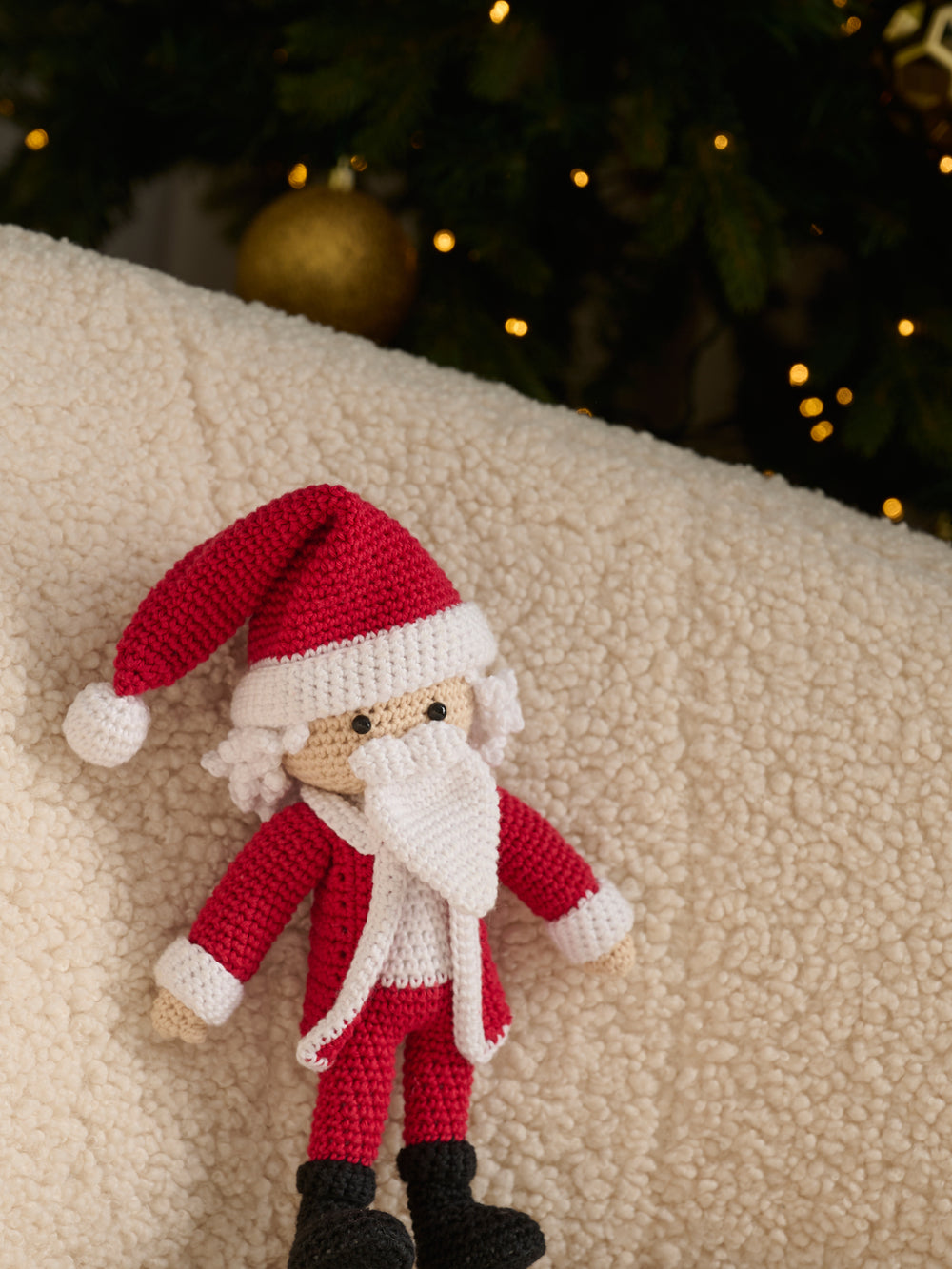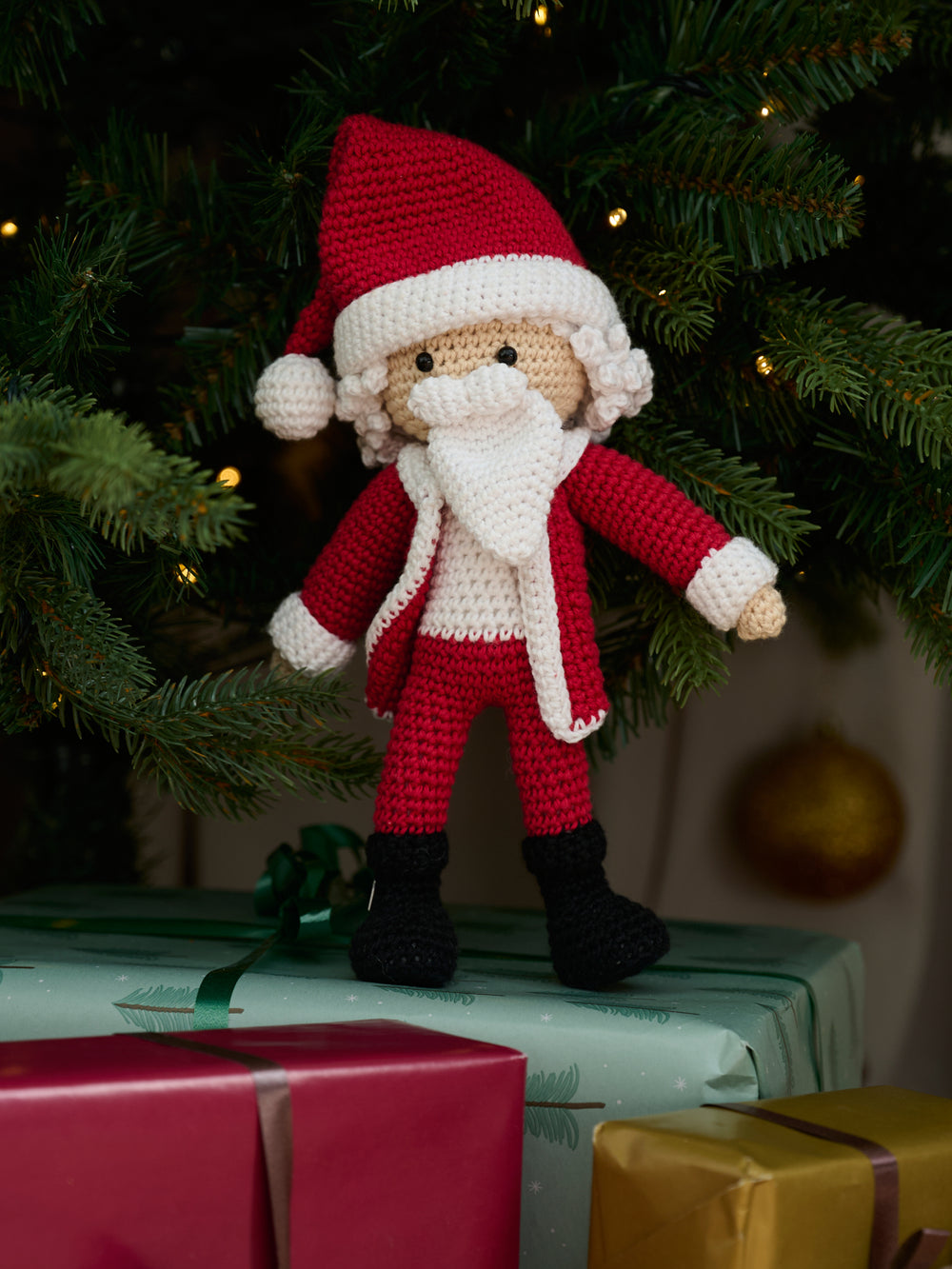 En søde julemand med lang skæg og tøj. Julemanden er hæklet i Mayflower Cotton 8/4, som er et klassisk 8/4-bomuldsgarn i høj kvalitet. Perfekt til hæklede designs som dette.