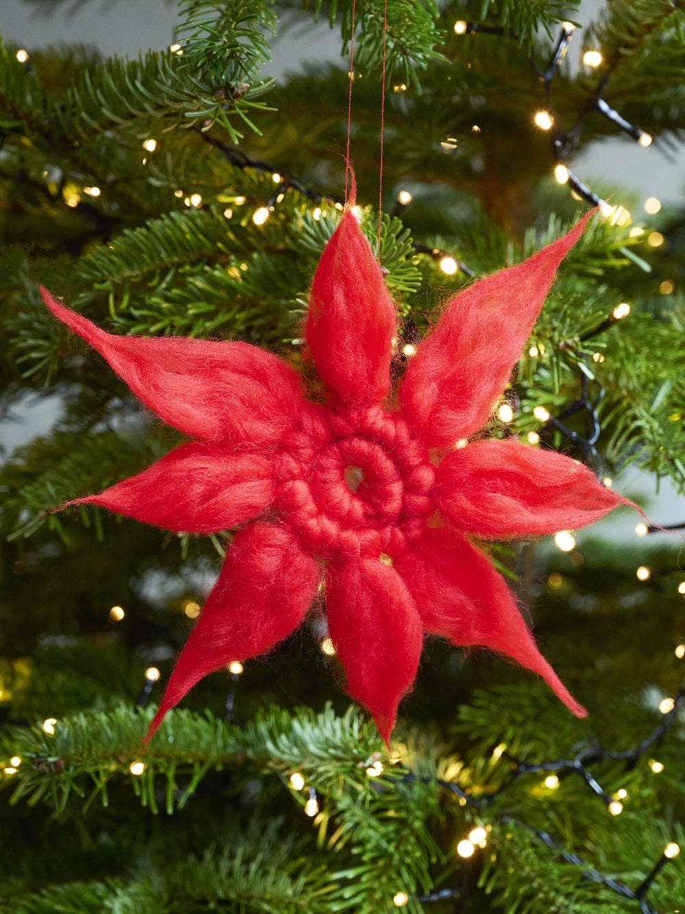 Skøn julestjerne, som ikke kræver vand, og som laves i en flot, stærk julerød. Den kan pynte såvel inde som ude, da den også er oplagt at hænge på et træ eller en busk ude i haven som pynt, hvor den vil lyse på de nøgne grene.