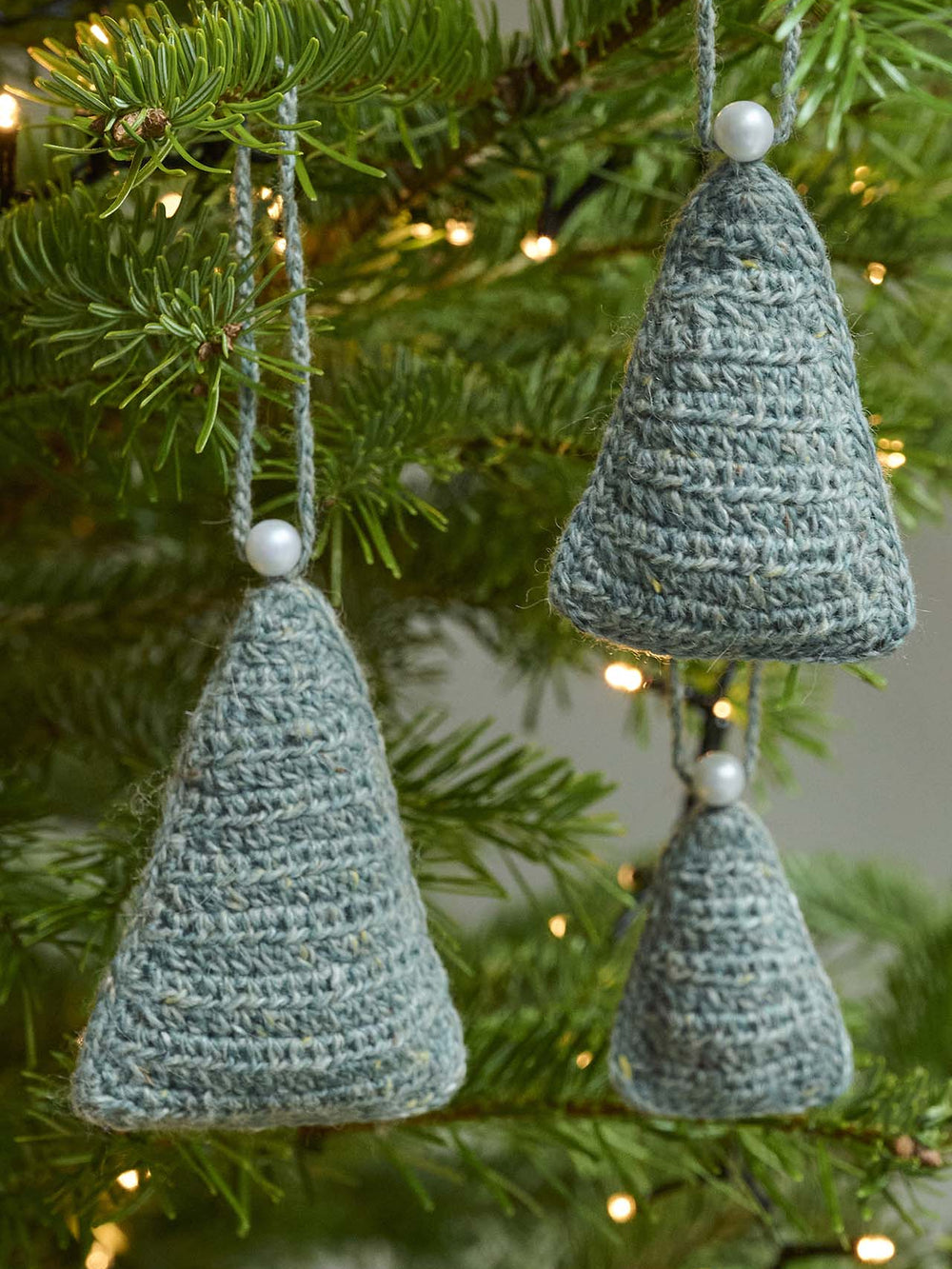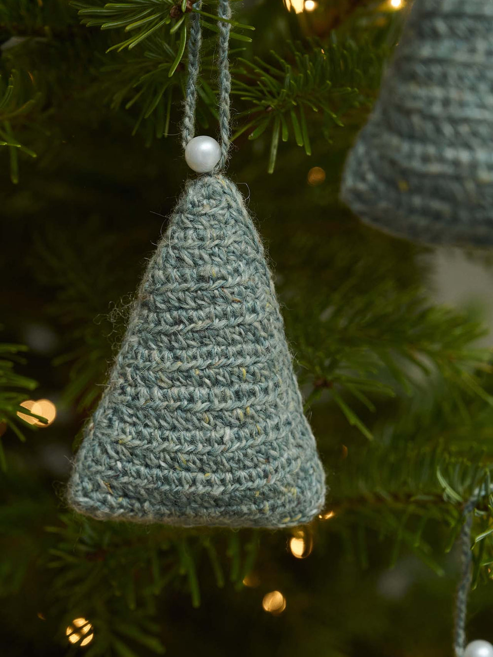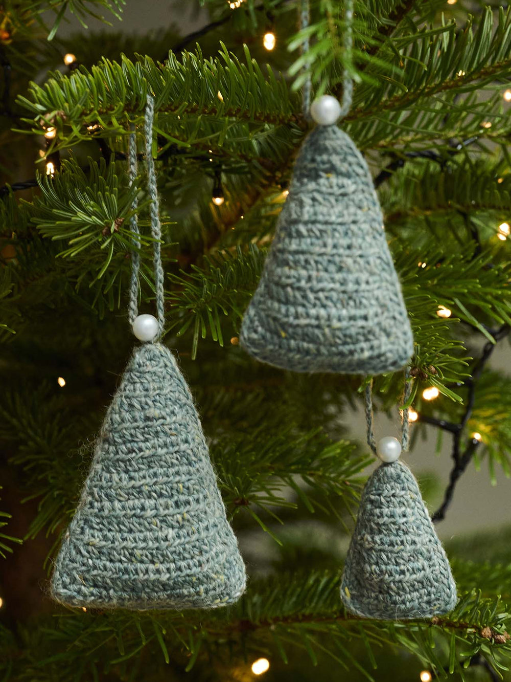 Enkelt hækleprojekt med juletræer i tre forskellige størrelser, som monteres med en hæklet snor, så de kan pynte på fx juletræet. Juletræerne hækles i Mayflower Birmingham, som er et flot tweedgarn, der giver juletræerne et flot farvespil.