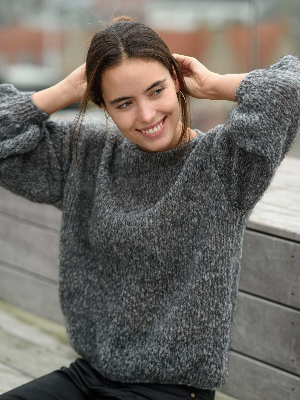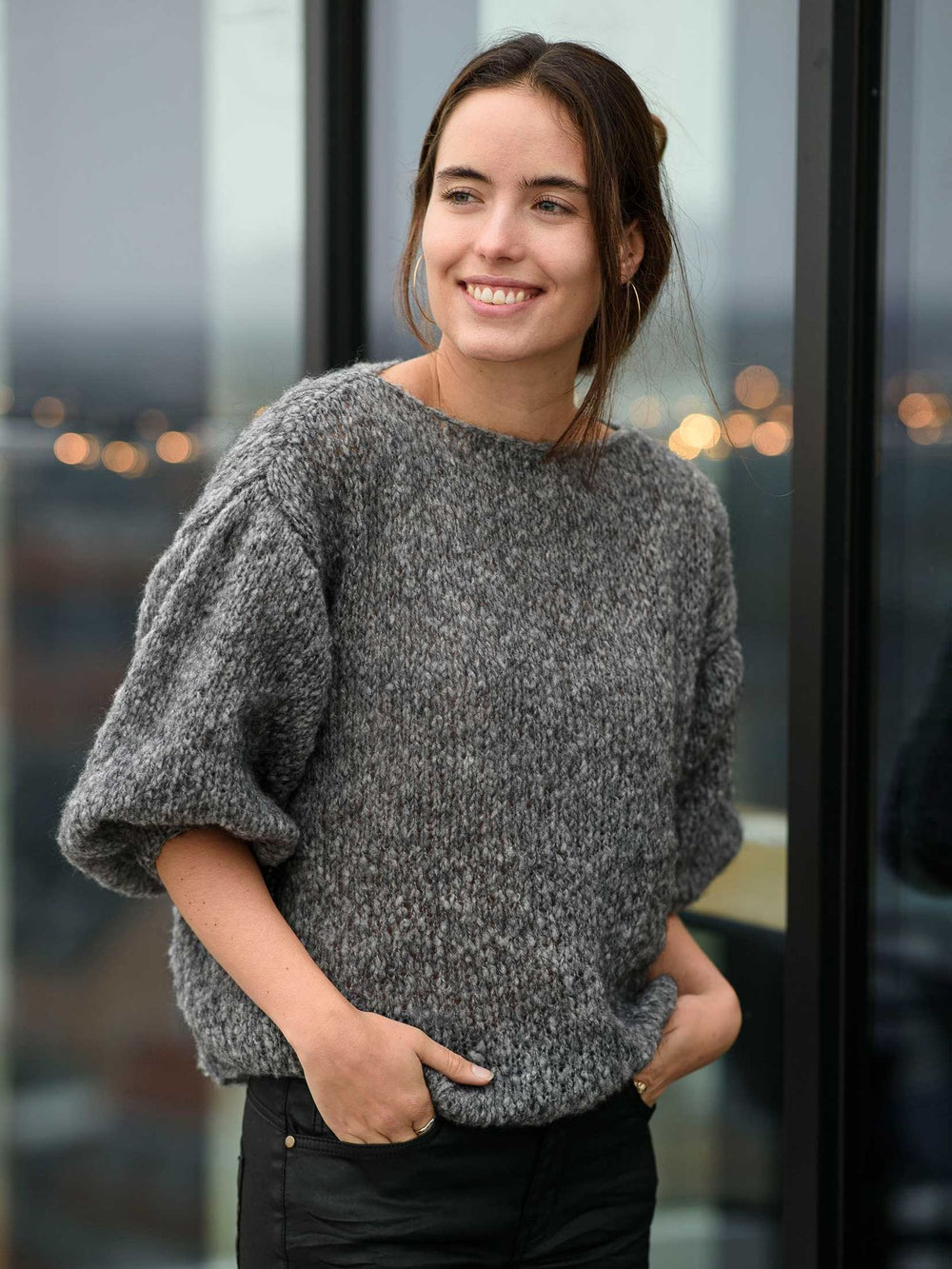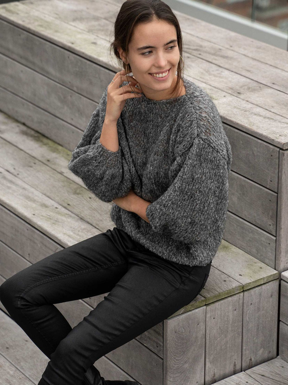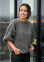 June sweateren er en nem opskrift på en enkel og stilren sweater med flotte ballonærmer. Det enkle design understreges af, at blusen kun har ribstrik i ærmekant og ikke i hverken halskant eller bunden. Det giver samtidig en lidt løsere pasform, som passer godt til det luftige garn.