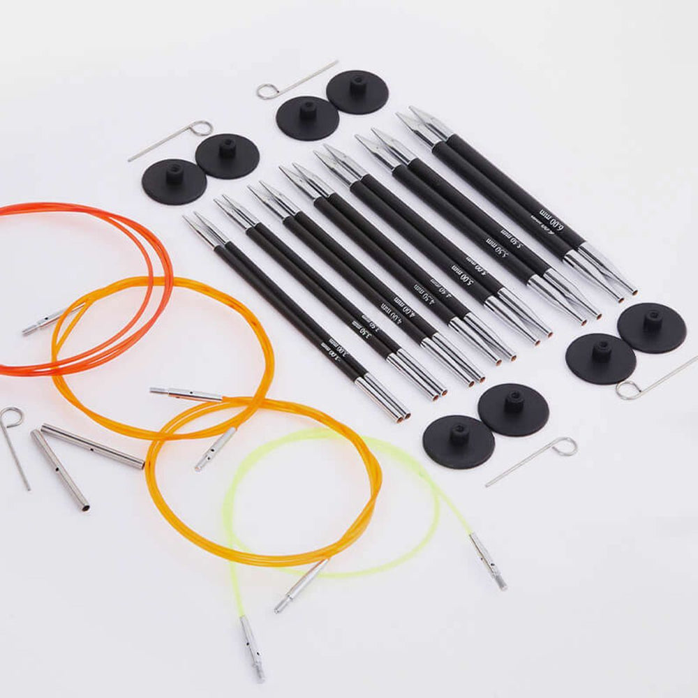Fordelen ved udskiftelige rundpinde er, at du nemt og enkelt kan skifte både pindstørrelse og wirelængden. Du har derfor ikke behov for at have flere forskellige rundpinde på lager, da du med dette sæt hurtigt kan lave netop dén rundpind, som dit strikkeprojekt kræver.