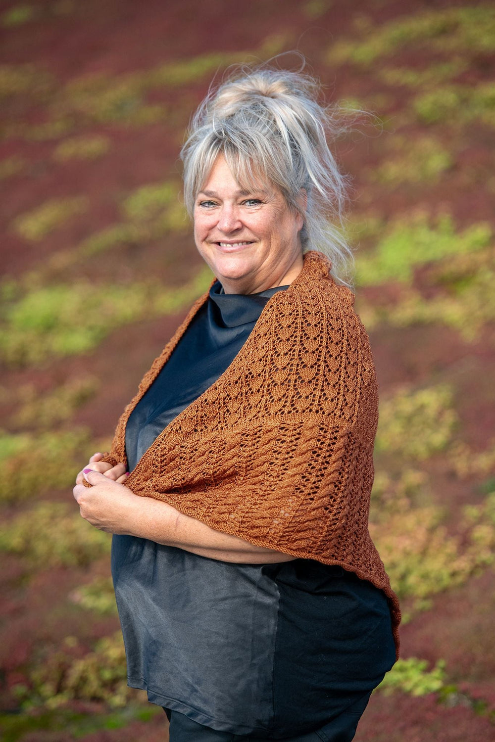 Karen sjalet strikkes nedefra og op i Mayflower Amadora, som er et håndfarvet uldgarn i ren merinould. Håndfarvningen betyder, at sjalet får et virkelig flot meleret farvespil, hvilket kun bidrager til, at slutresultatet bliver endnu flottere i kombination med det betagende hulmønster. Garnet er desuden virkelig blødt, hvilket gør sjalet enormt lækkert og behageligt at have på, ligesom det luner.