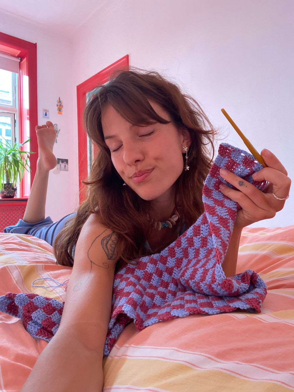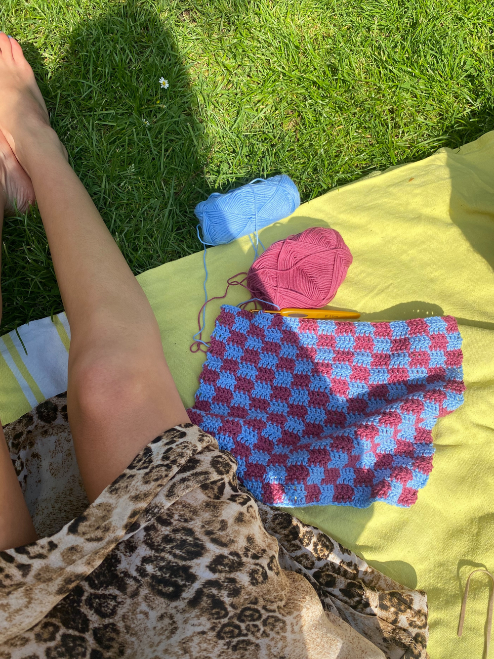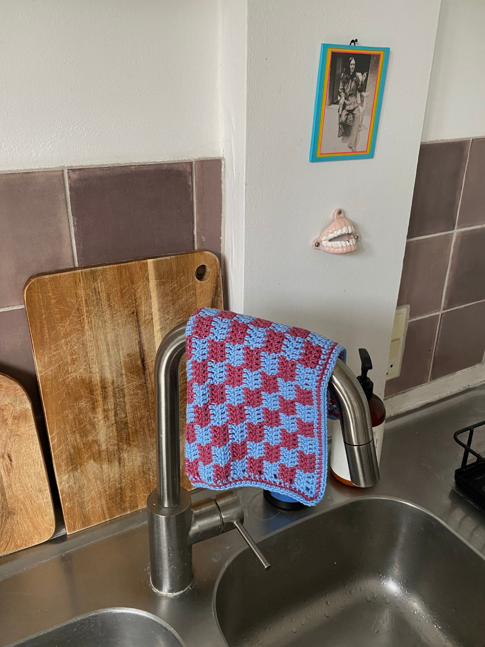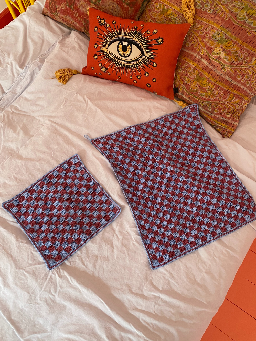Hækl et sæt til køkkenet bestående af en karklud og en viskestykke, som begge er i et ternet design.