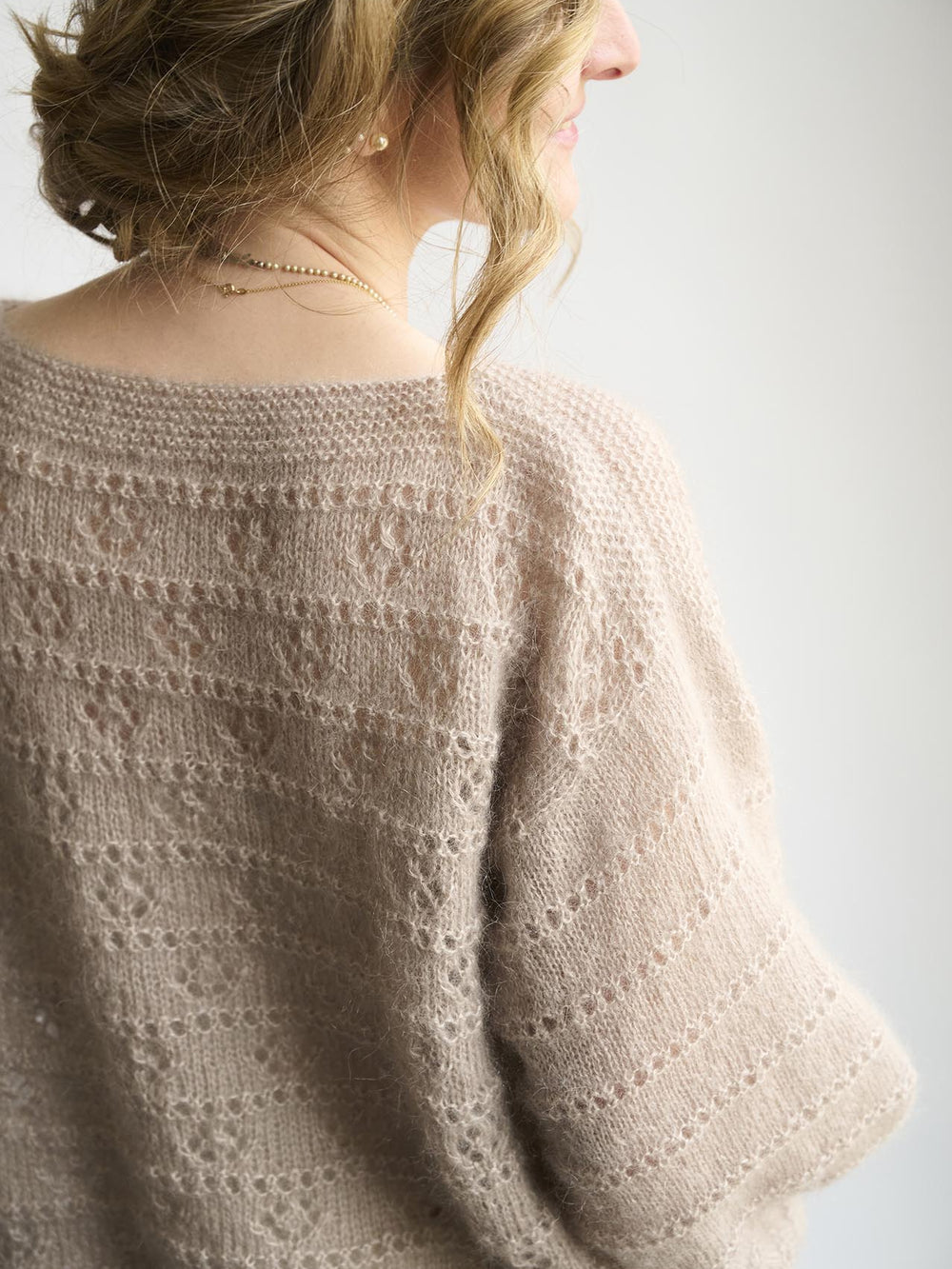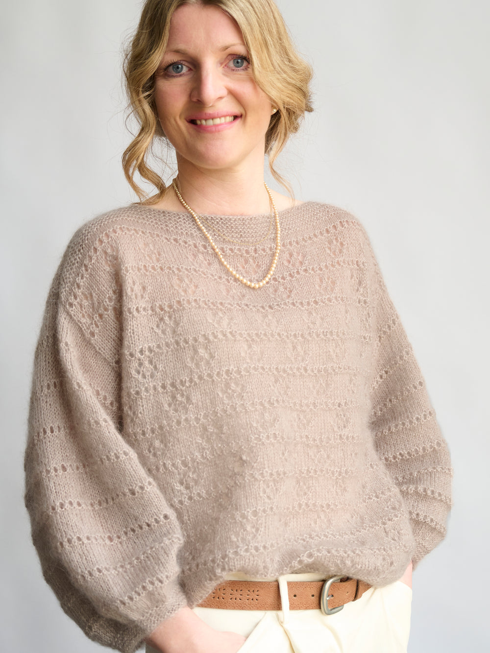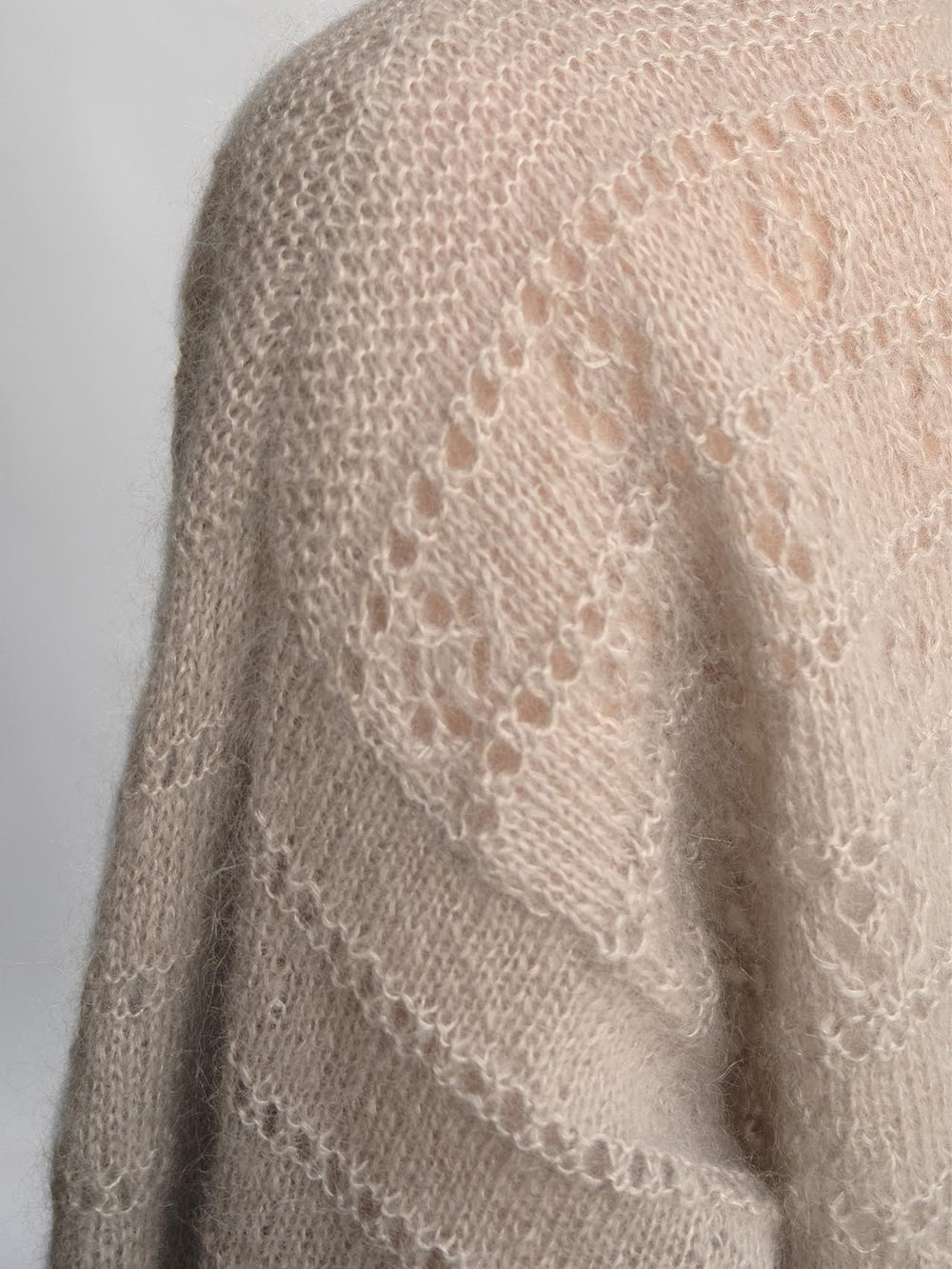 Smuk, enkel og luftig sweater, som strikkes nedefra og op med et dekorativt hulmønster på både krop og ærmer.