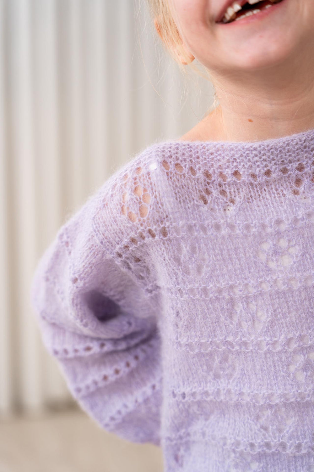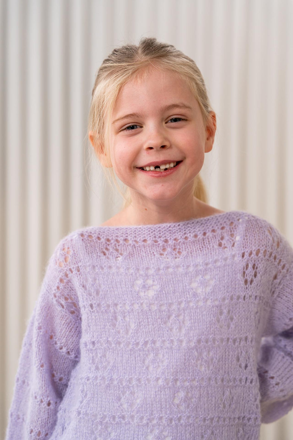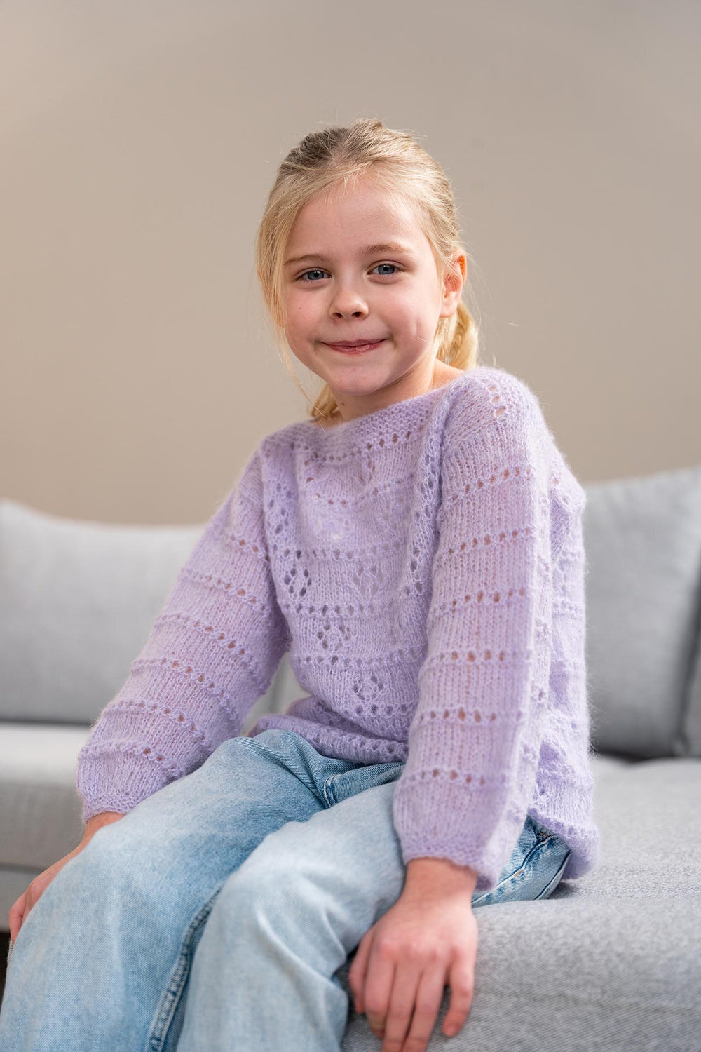 Kirse sweater junior er en dekorativ bluse i str. 2-10 år, som strikkes oppefra og ned i et fint hulmønster med to tråde Mayflower Elba. Resultatet er derfor en virkelig blød og lækker sweater.