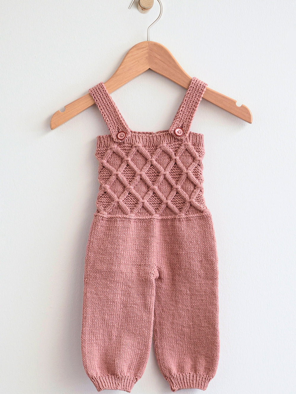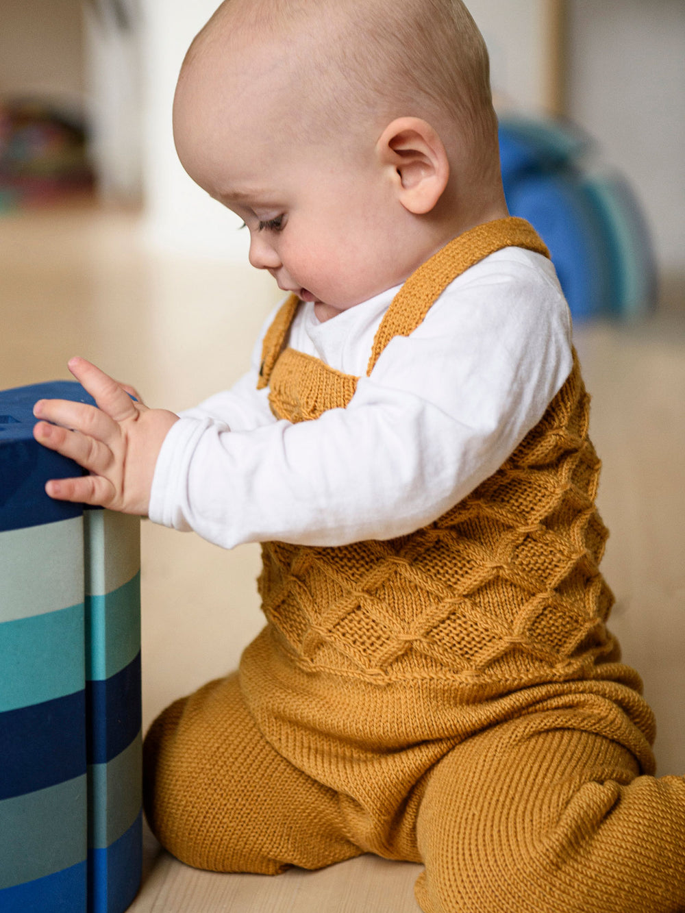 Mønsteret over brystet gør, at garnet bliver elastisk, og mønstret er derfor med til at sikre, at bukserne bliver siddende, mens de samtidig også er behagelige og ikke strammer. I glatstrikken på benene bliver strikkefastheden lidt løsere, hvilket giver mere plads og god bevægelighed til benene. En ribkant nederst på benene søger for, at bukserne ikke kravler op.