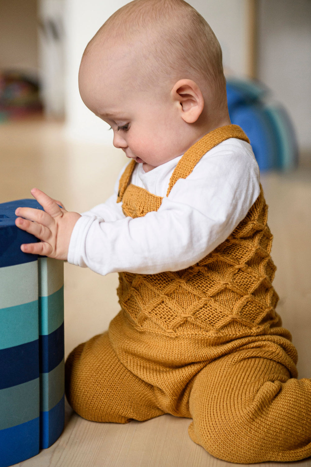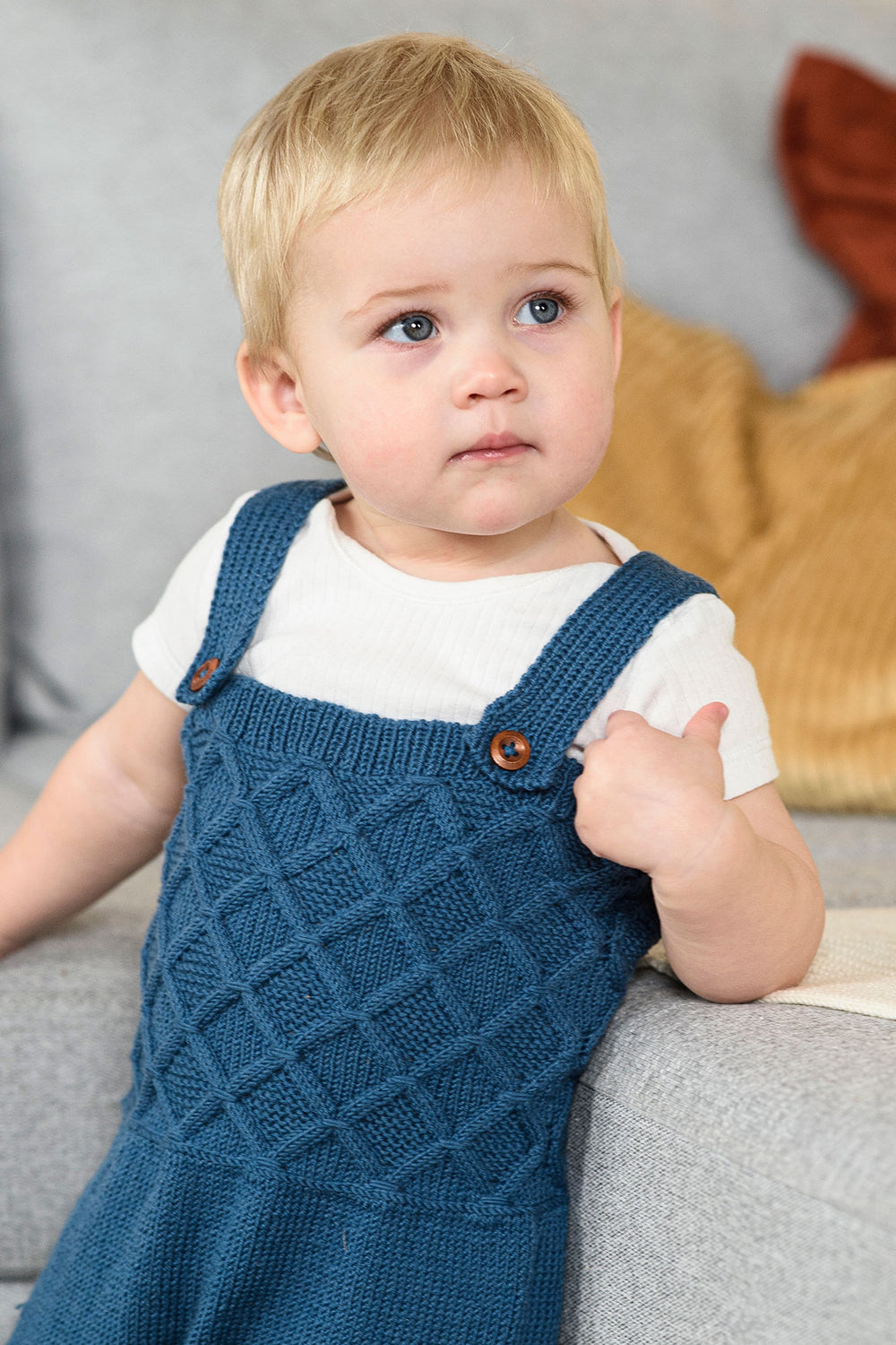 Da bukserne strikkes oppefra og ned, er det nemt at tilpasse både skridt- og benlængden til barnet, ligesom du også nemt kan tilpasse længden på selerne. Størrelserne i opskriften er udarbejdet ud fra gængse størrelsesguides, og det er derfor vigtigt, at du tager højde for overvidden på baby, når du vælger, hvilken størrelse du vil strikke.