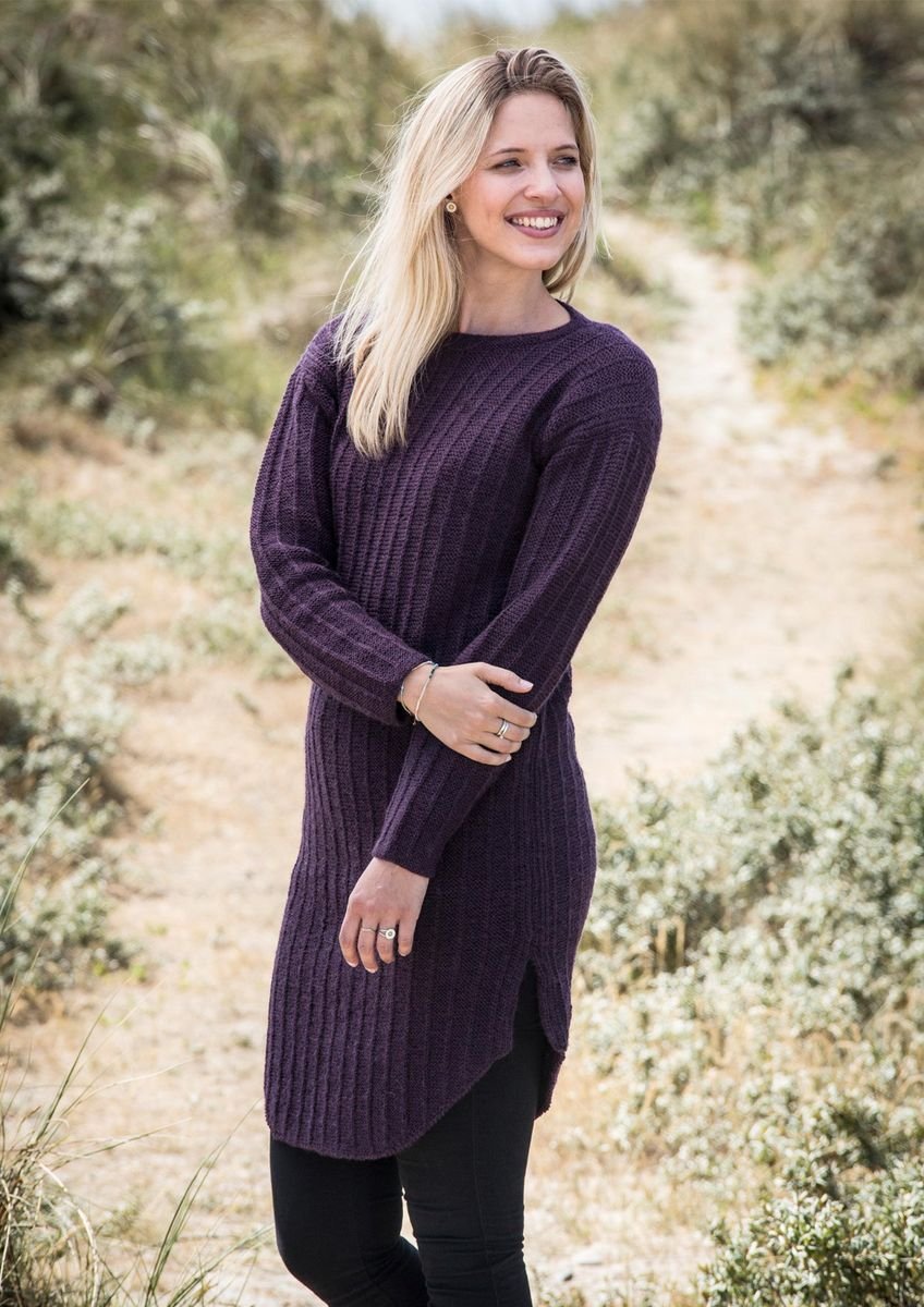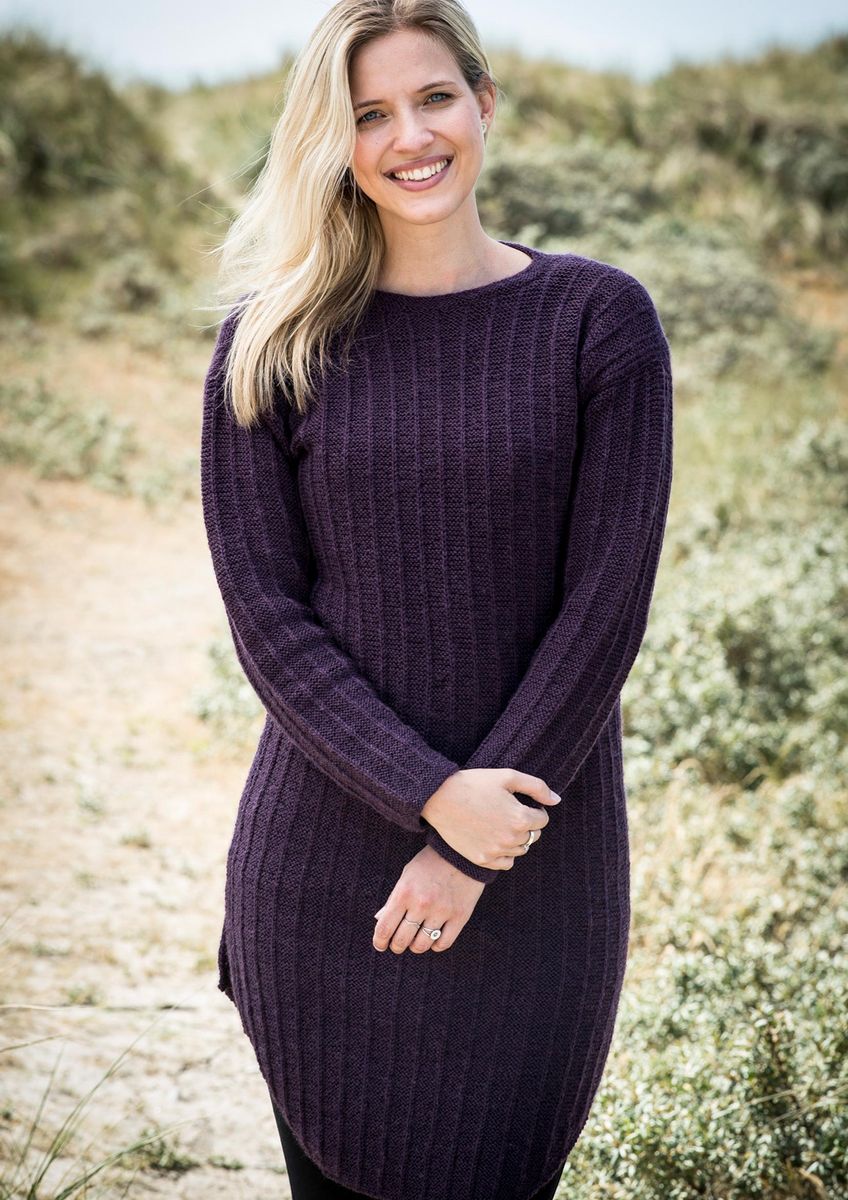 Flot moderne smuk og elegant kjole eller tunika strikket i en flot aubergine farve som vist på billedet. Denne flotte kjole kan bruges med leggins og et par rå støvler eller med flotte strømper og elegante sko for et lidt finere look. Fantasien sætter kun grænsen. Denne smarte kjole er strikket i Mayflower Easy Care. Mayflower Easy Care er den tynde uldgarn i serien fra Mayflower hvor der også findes den lidt tykkere garn kaldet Mayflower Easy Care Classic helt ovre i den tykke kvalitet kaldet Mayflower Easy Care Big. Mayflower Easy Care findes som de to andre tykkelser i et væld af farver og bliver hele tiden opdateret med de nyeste indenfor moden. De samme farver går igen inden for alle tre tykkelser. Mayflower Easy Care består af 100% ren uld, og er så nemt at det kan vaskes i maskine på uld vask og tørres i tørre tumbler. Lige til at gå til for den travle person hvor alt skal være klart til næste morgen. Se de mange smukke farver her på siden og download opskriften ganske gratis.