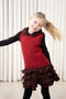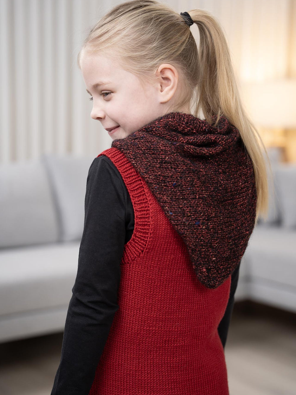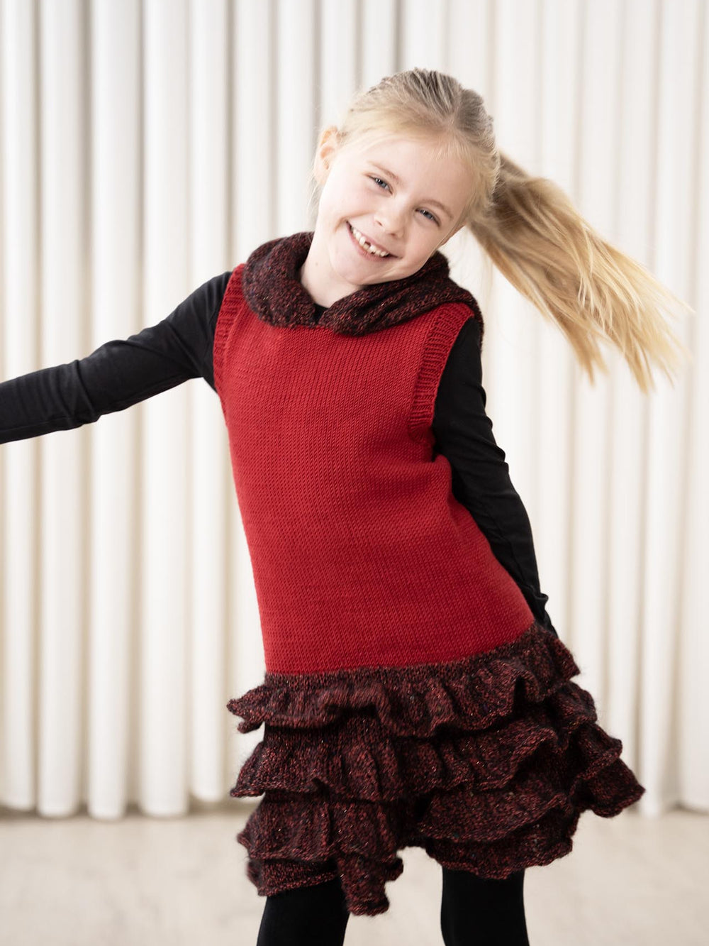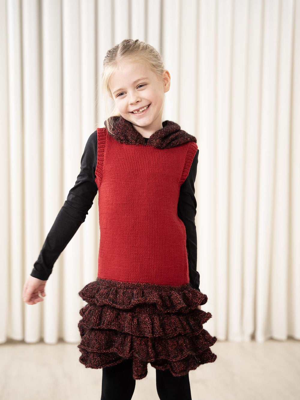 En herlig, ærmeløs kjole til børn, der er lidt rå i looket med hætte på vesten og flæser på den korte nederdel. Du starter med vesten, som strikkes rundt nedefra og op og deles ved ærmegab. Så laves hætten og til sidst nederdelen i glatstrik med vrangriller, hvori der strikkes flæser.