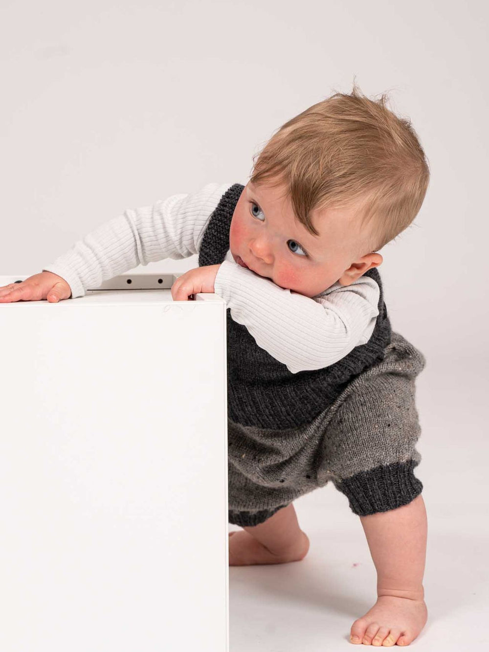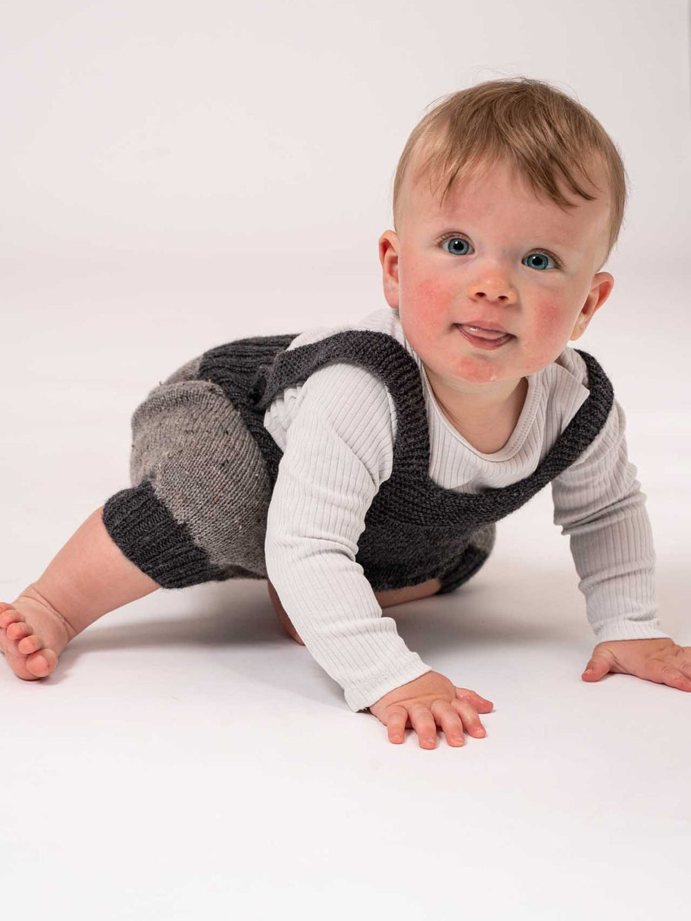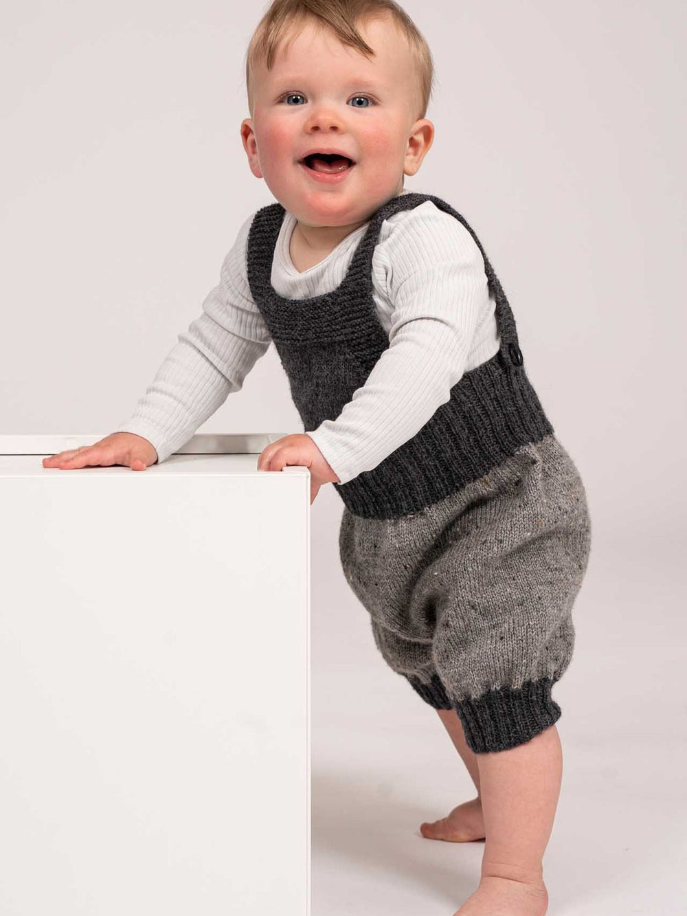Klodshans selebukserne strikkes i uldgarnerne Mayflower Easy Care og Easy Care Tweed. Brugen af to forskellige garnfarver giver flotte kontraster, og brugen af tweed giver et flot, klassisk farveudtryk til designet. Da garnerne har samme strikkefasthed og løbelængde, er der mulighed for at lege med farverne, sammensætningerne og udtrykket, hvor du fx kan vælge at strikke hele dragten i tweedgarn eller lave en ensfarvet dragt. Under alle omstændigheder vil selebukserne være enormt komfortable, da begge garner er bløde, lune og isolerende med høj åndbarhed og derfor ideelle garner til små børn.