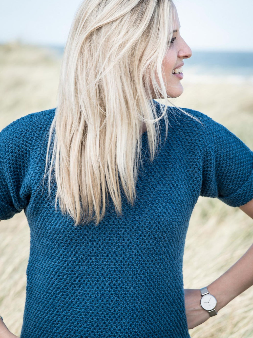 Blusen er helt enkel og derfor er den også forholdsvis overskuelig at strikke. Ryg og forstykke strikkes hver for sig med det flotte strukturmønster, som strikkes henover fire pinde.