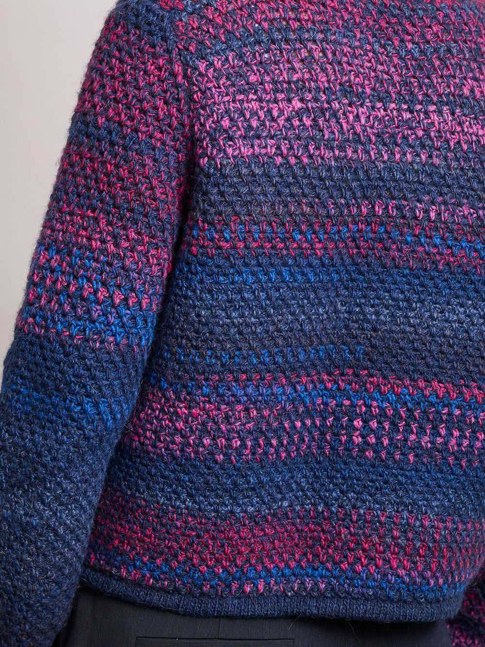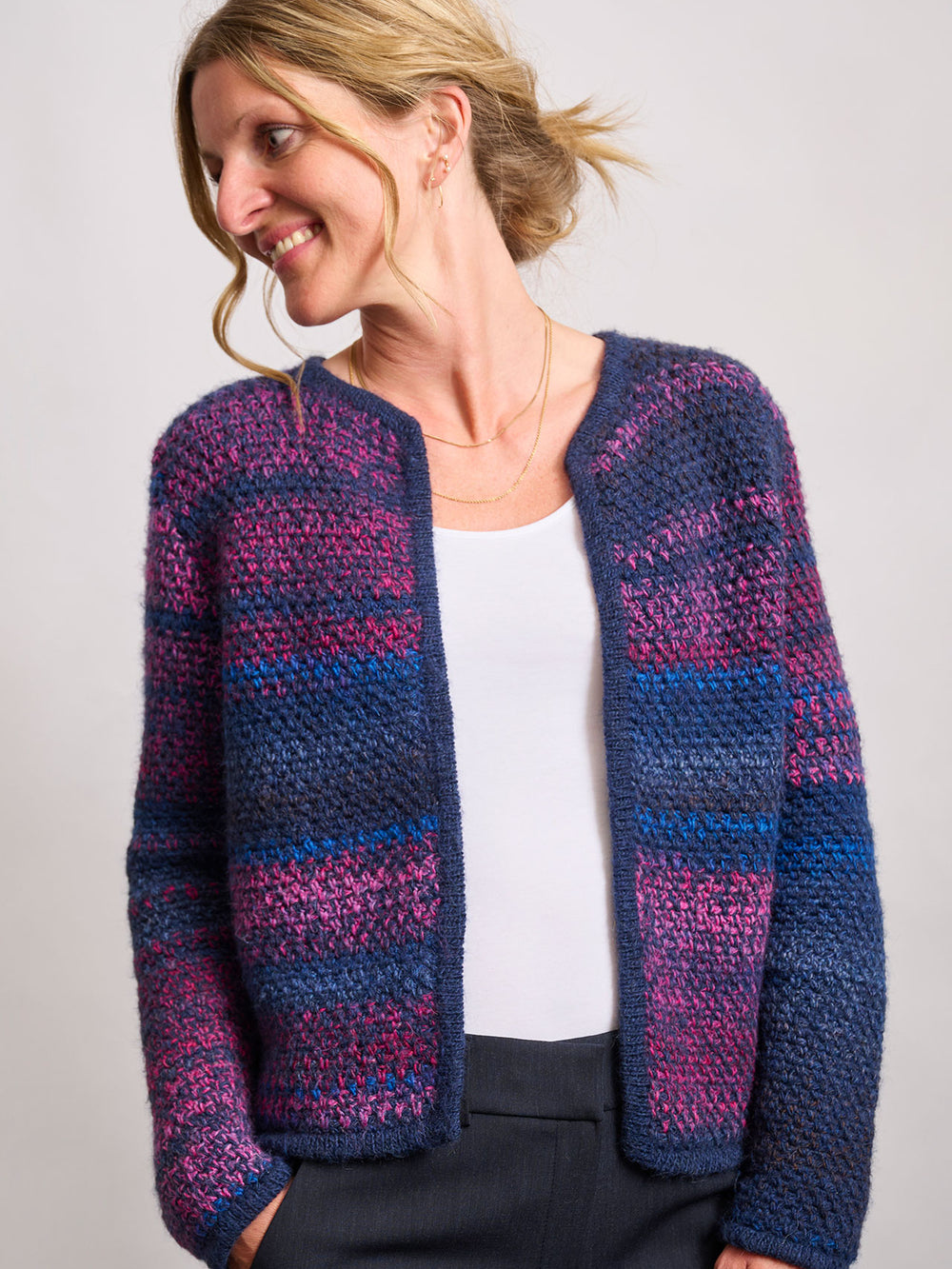 Kort og klassisk hæklet jakke, der er prikken over i’et, når stilen skal være lidt festlig. Jakken hækles i et mønster med 2 tråde (1 tråd af hver kvalitet), mens kanterne skal strikkes. Ryg og forstykker strikkes og hækles samlet op til ærmegab, hvorfor delene hækles færdige hver for sig. Skuldrene hækles sammen, og der hækles ærmer, som sys på til sidst.