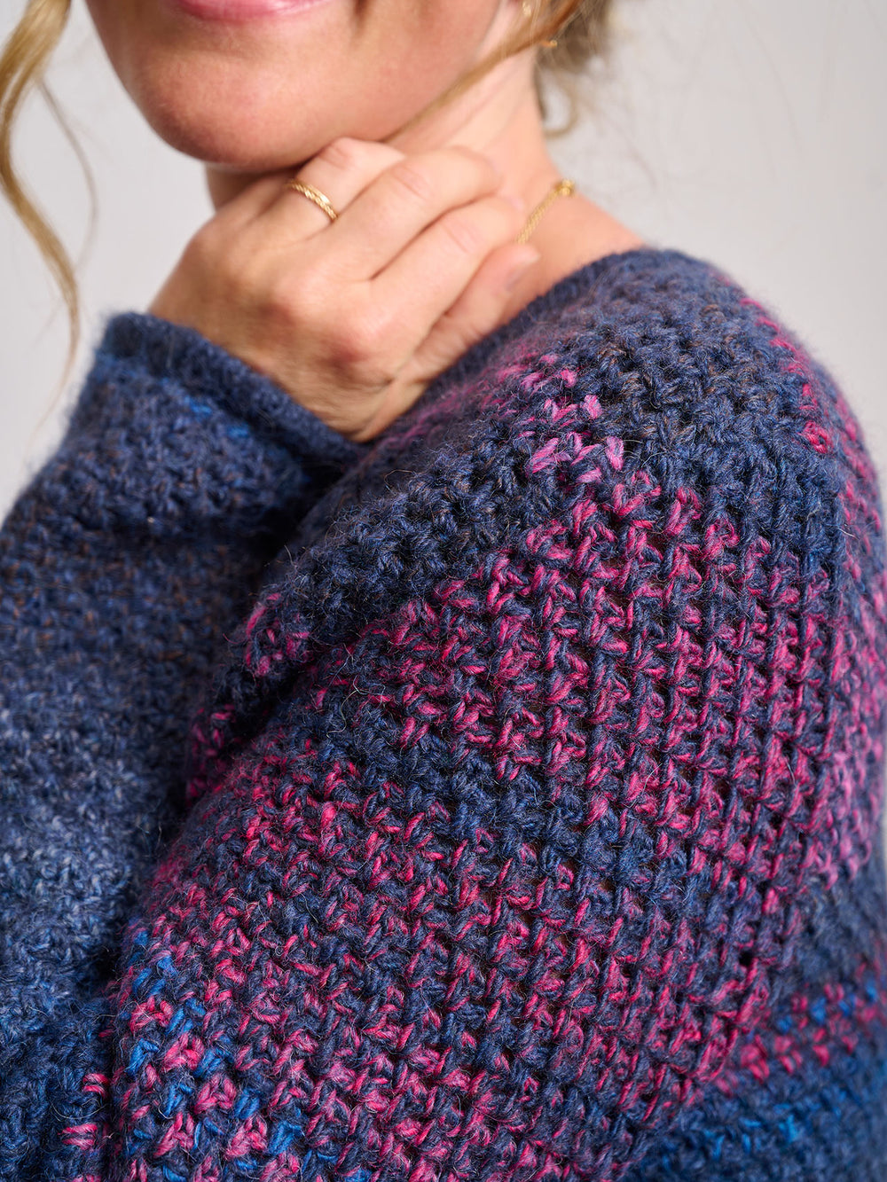 Jakken er lavet i en kombination af det ensfarvede Mayflower Taormina Shade og Taormina med flotte farveskift. Begge garnkvaliteter er helt ens og har det tilfælles, at de er en alpaka-blanding, som er ekstrem blød og en lille smule vamset. Du kan også finde denne model i Chanel-look i andre garnkvaliteter blandt Mayflowers opskrifter, hvor den er hæklet i bl.a. med Mayflower Premium Athena og Mayflower Birmingham. Jakken skal vaskes i hånden med uldsæbe.