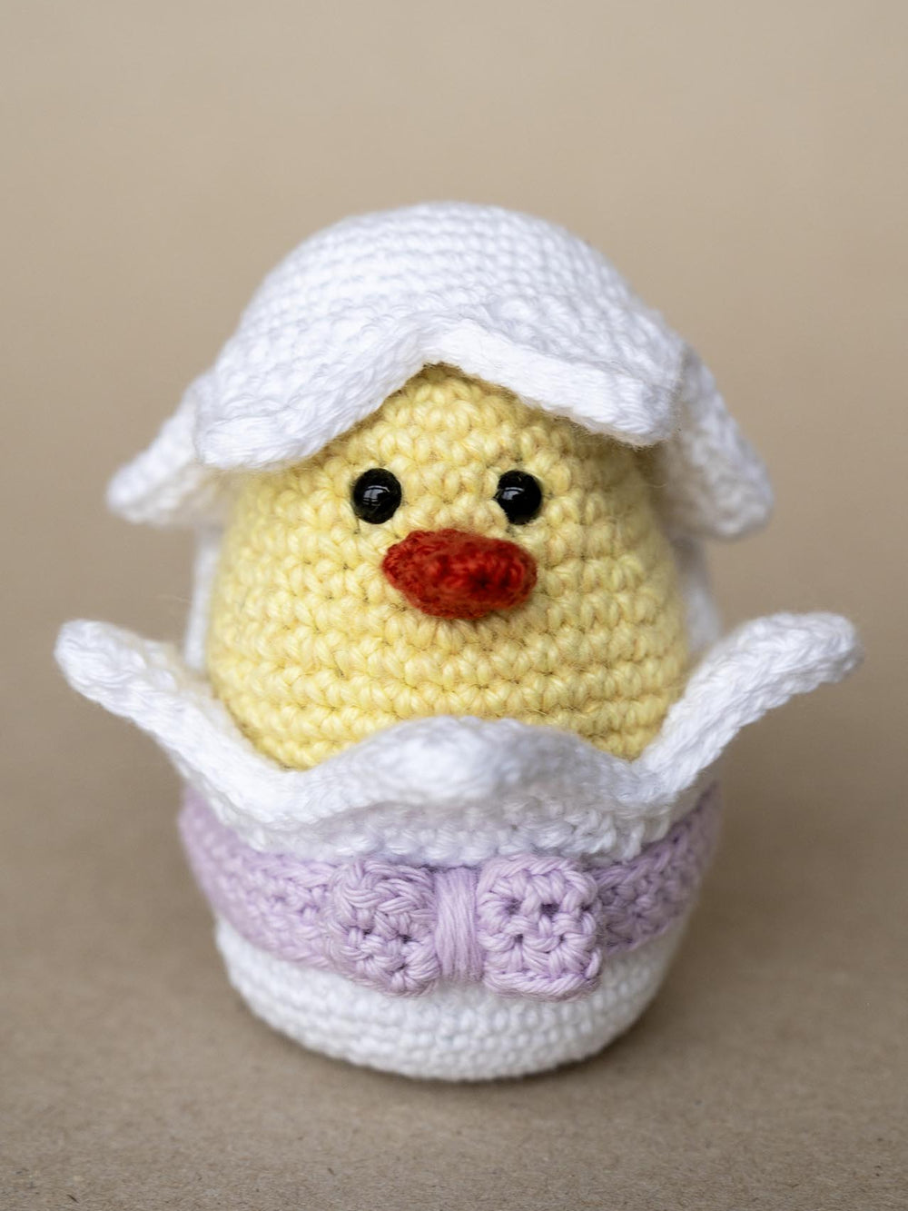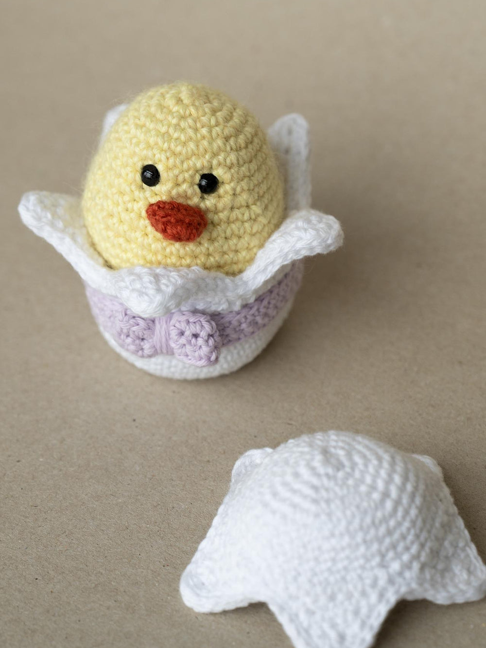 Den hæklede kylling sidder i et påskeæg og er en sød lille figur, der kan være med til at skabe en hyggelig stemning ved påskebordet eller give som gave.