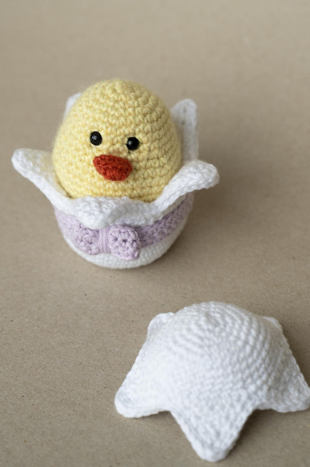 Den hæklede kylling sidder i et påskeæg og er en sød lille figur, der kan være med til at skabe en hyggelig stemning ved påskebordet eller give som gave.