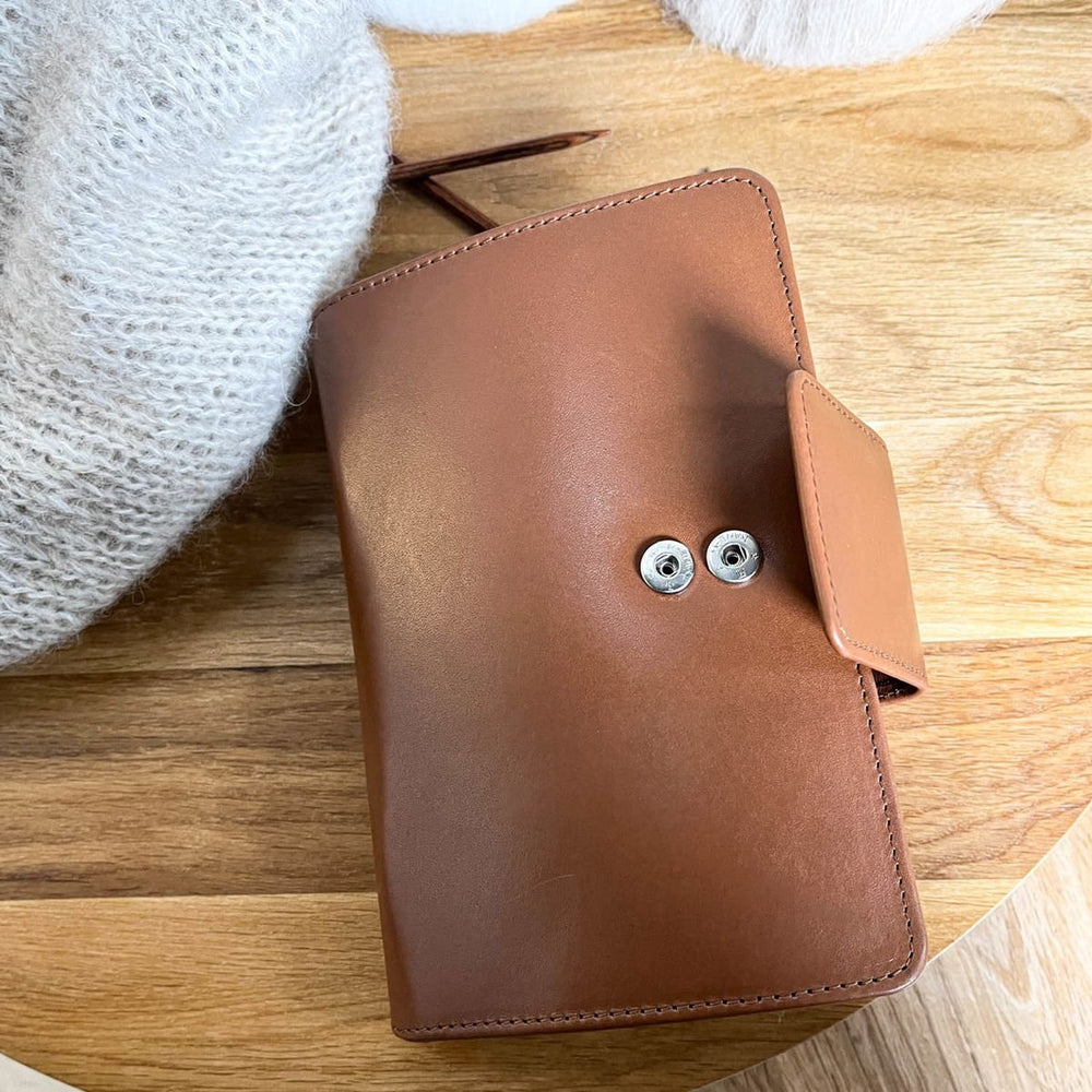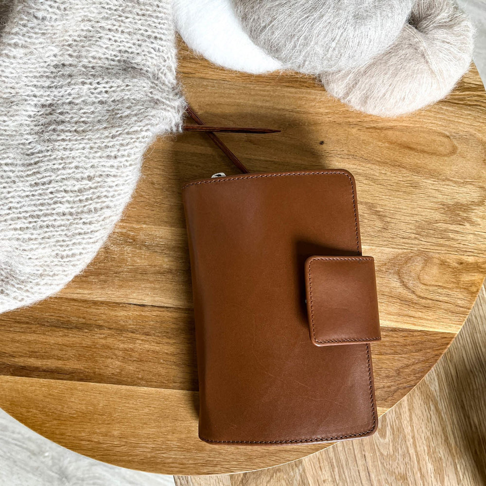 Læderet i et helt nyt etui er bevidst meget stramt. I brug vil læderet give sig og forme sig efter dine strikkepinde. Etuiet måler 19 x 13 cm og fås også i farven sort.