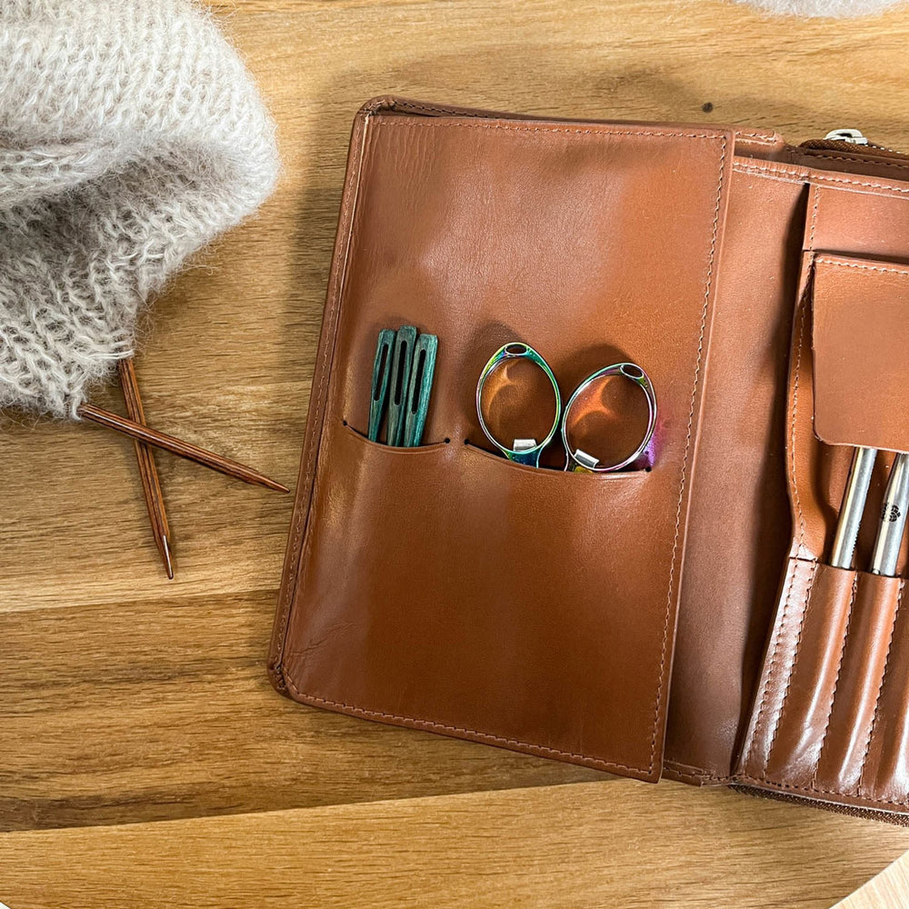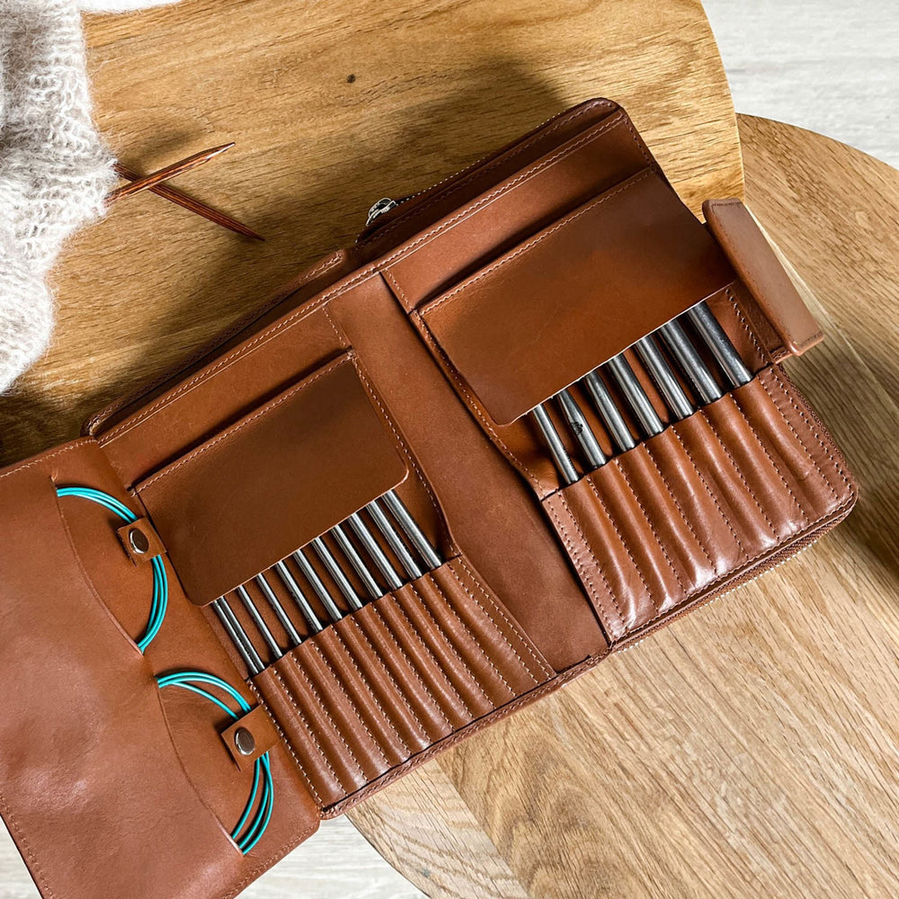 Eksklusivt og stilfuldt strikkeetui i ægte læder, hvor der er tænkt over både design og funktion. Udover at være elegant opbevaring af dine udskiftelige rundpinde og strikketilbehør er det rummelige etui nemlig også praktisk og nemt at have med på farten.