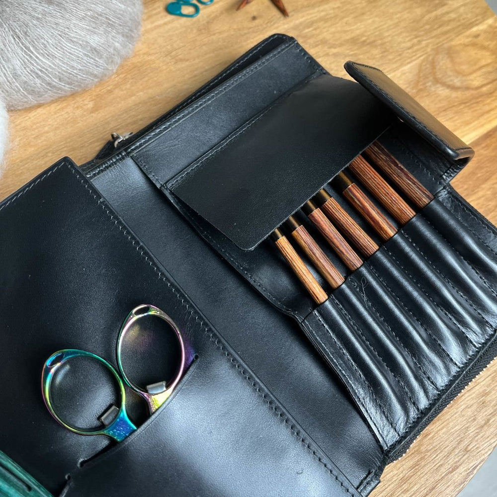 I dette eksklusive og stilfulde strikkeetui er der tænkt nøje over både funktionalitet og design. Det rummelige etui er praktisk og elegant opbevaring af både dine udskiftelige rundpinde og strikketilbehør. Etuiets størrelse gør det nemt at tage med i tasken sammen med dit strikketøj.