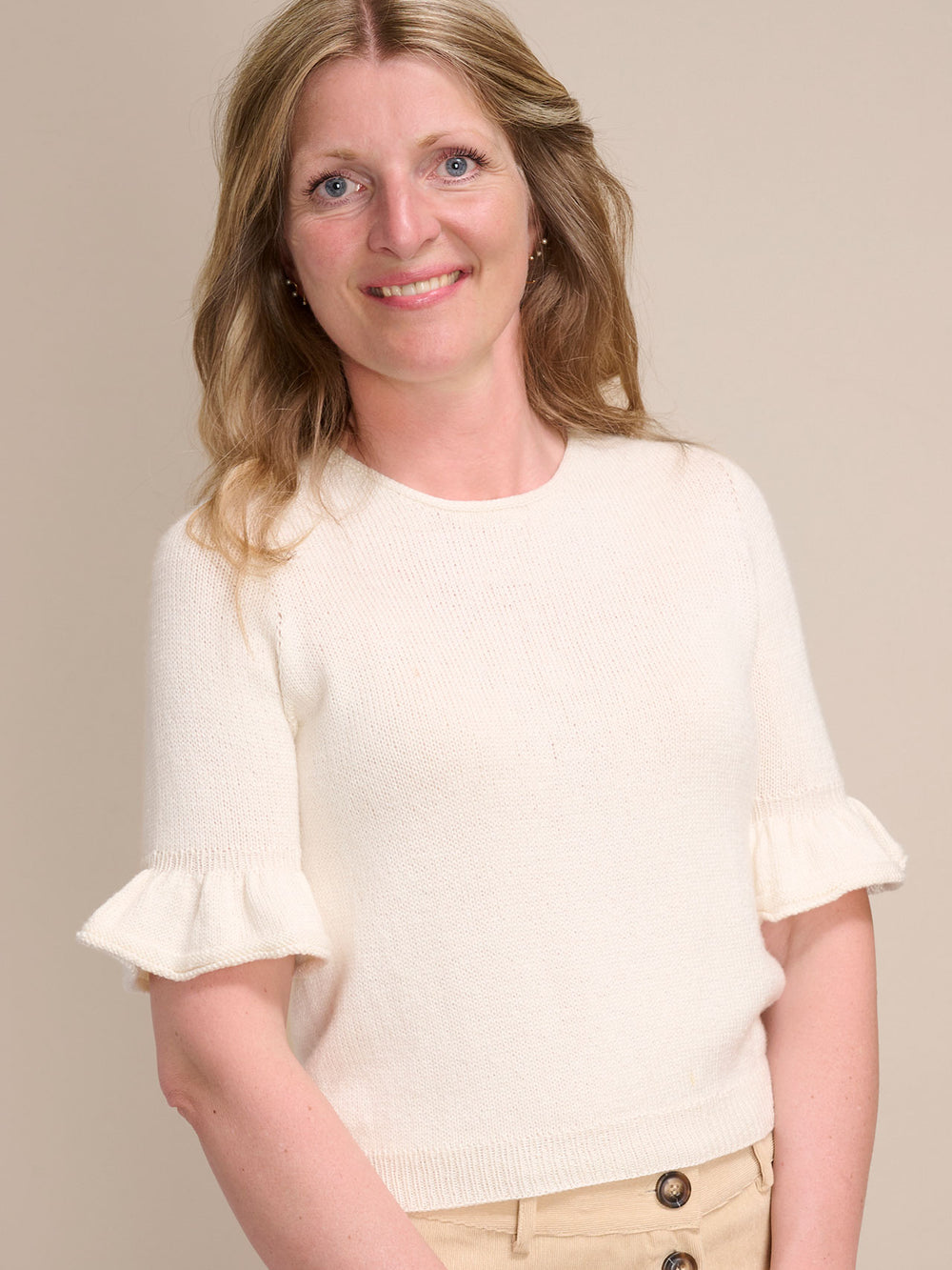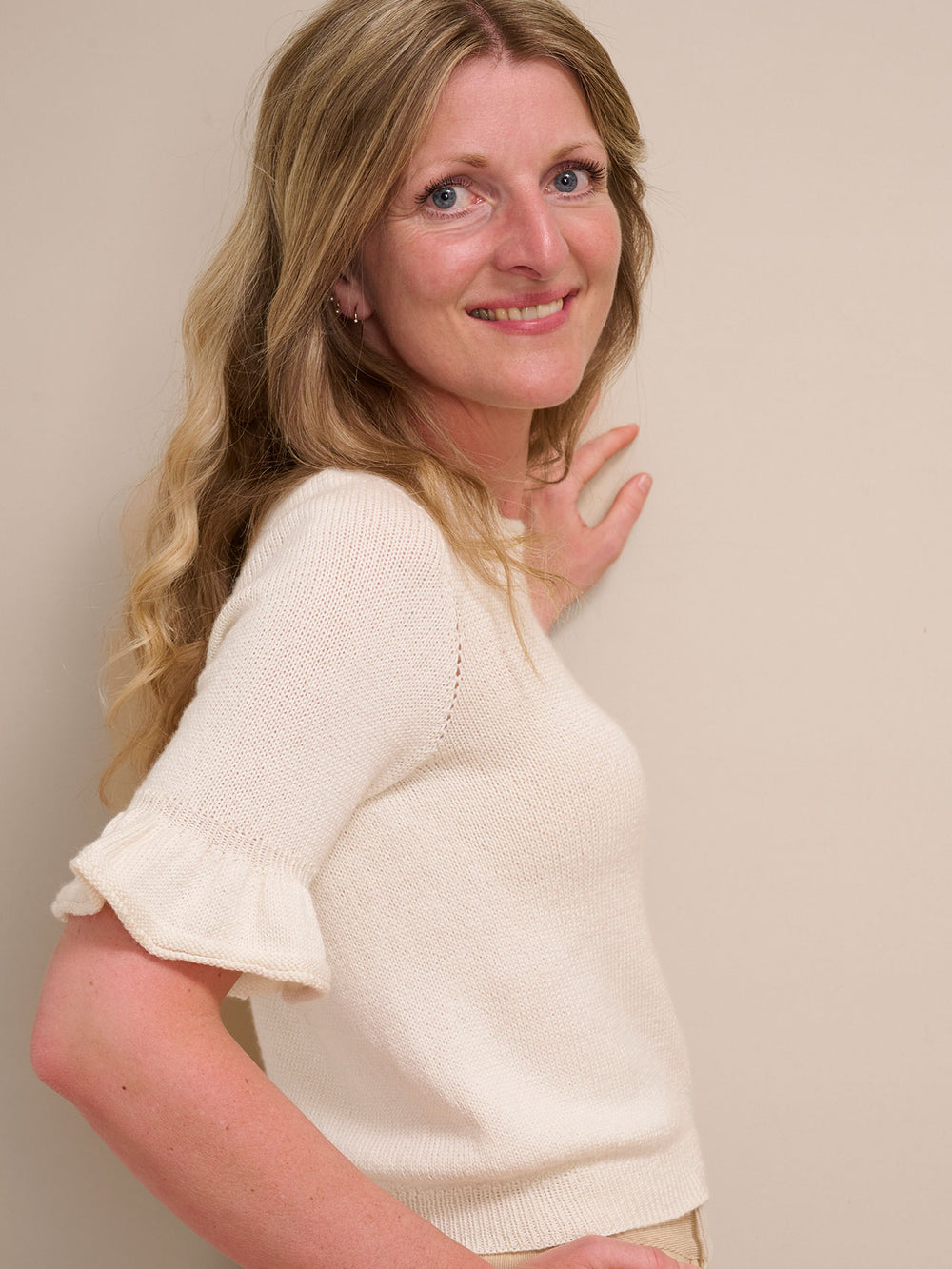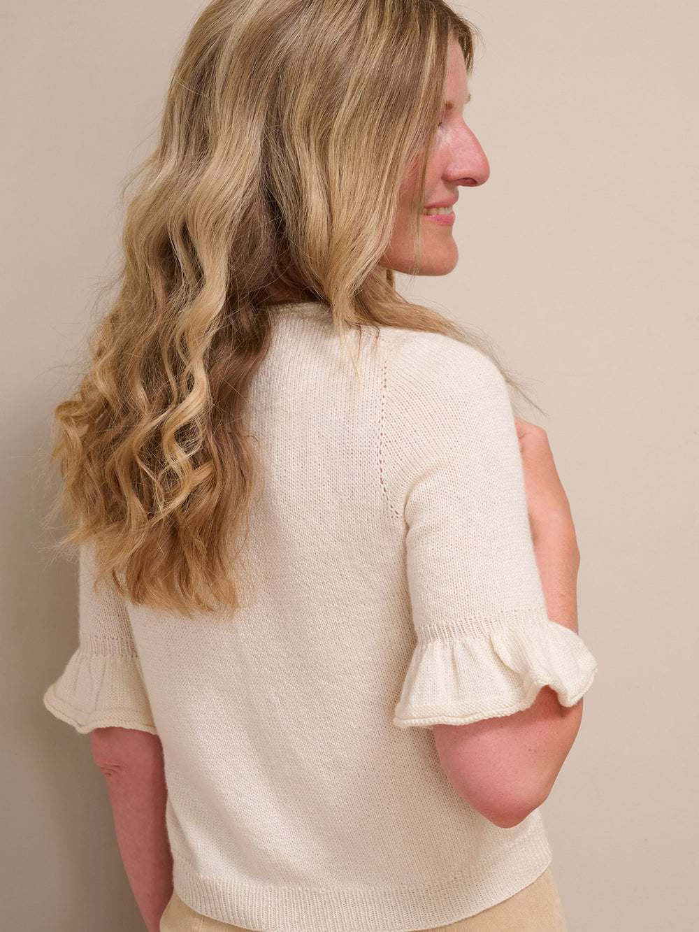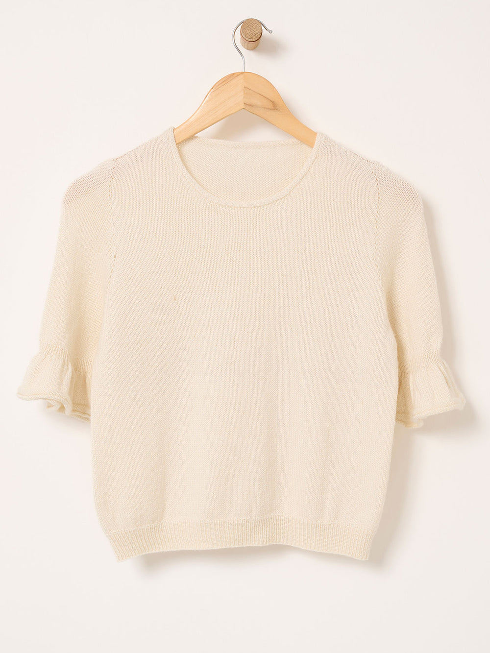 Smuk bluse med flæser på de 3/4-lange ærmer. Leonora tee strikkes oppefra og ned med rund hals og raglanudtagninger. Leonora tee er virkelig blød og føles utrolig let og behagelig at have - også om sommeren.