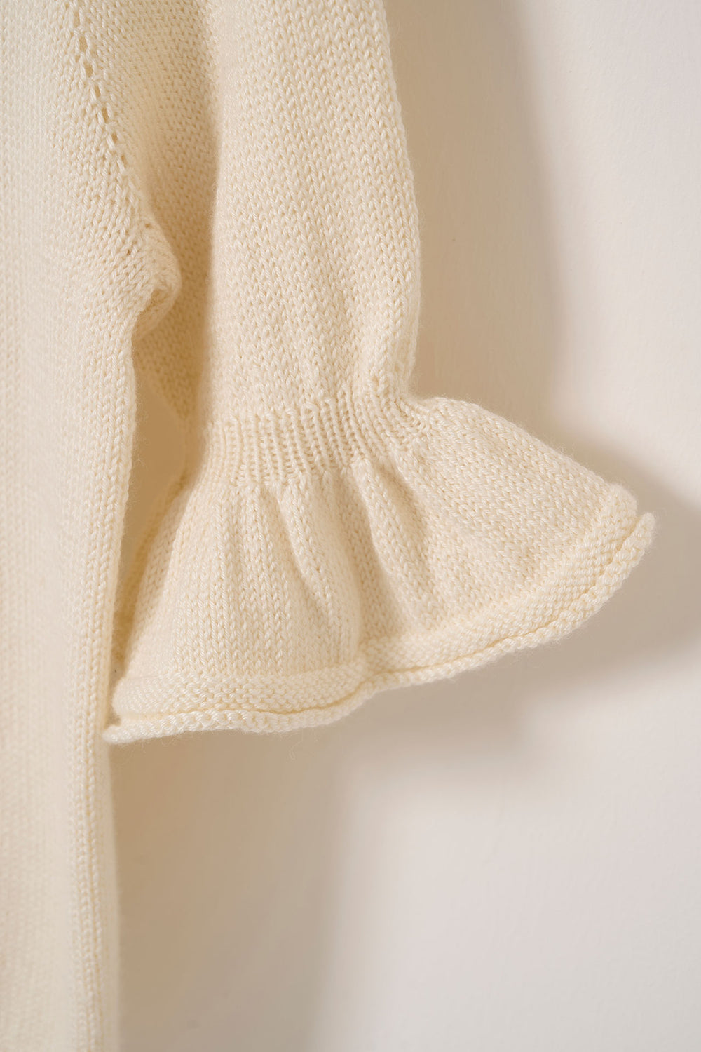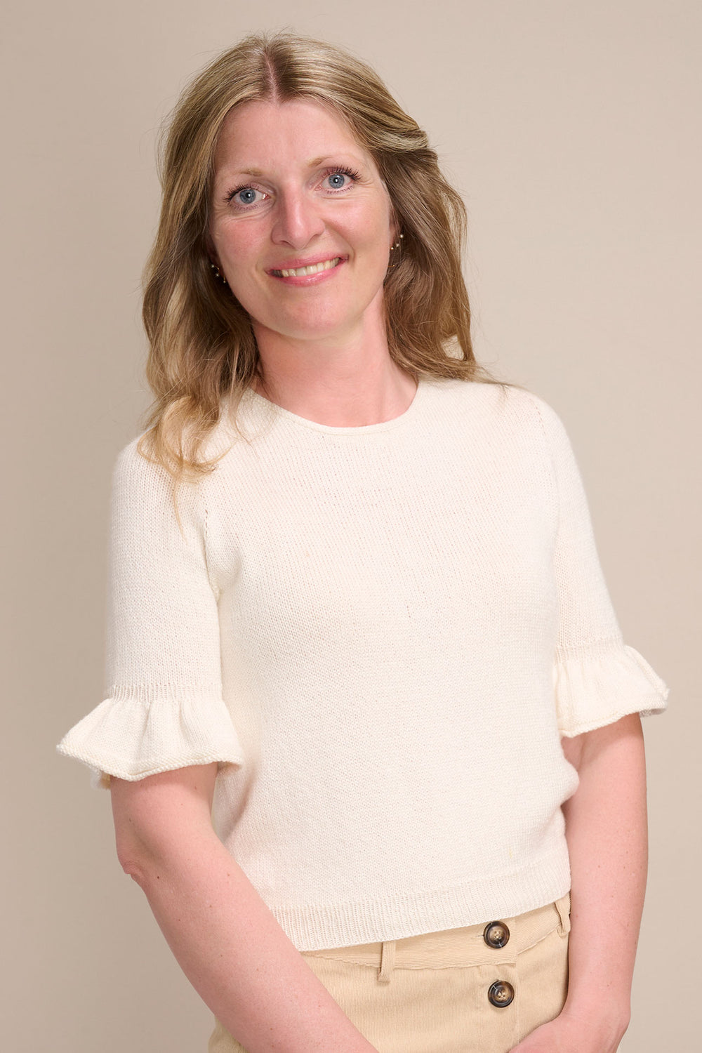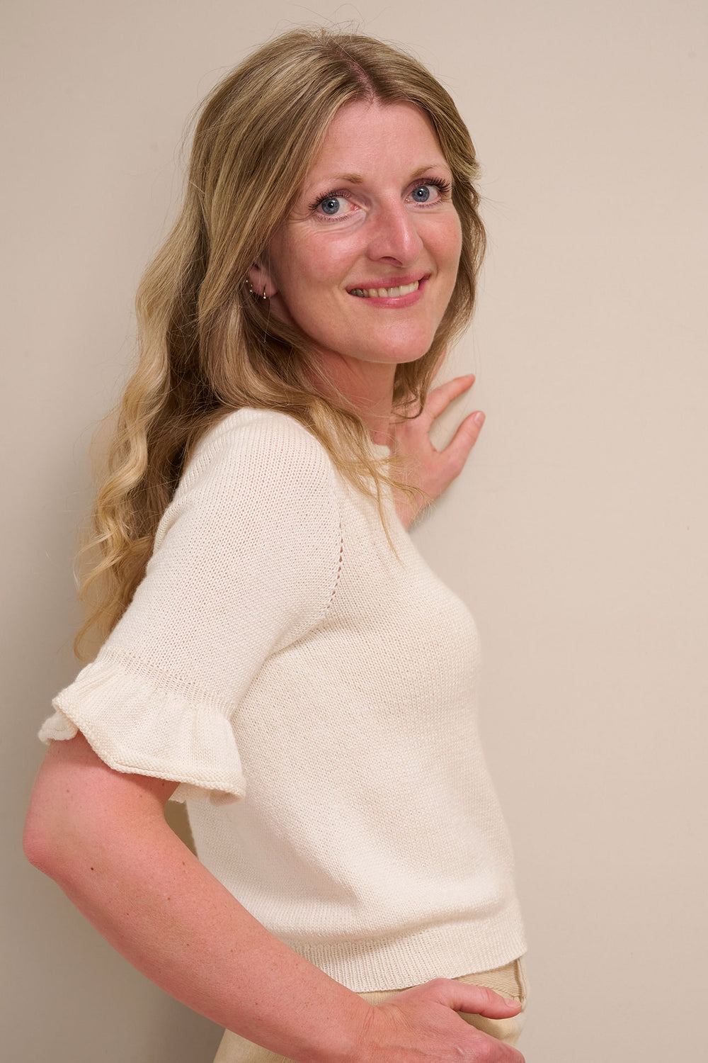 Smuk bluse med flæser på de 3/4-lange ærmer. Leonora tee strikkes oppefra og ned med rund hals og raglanudtagninger. Leonora tee er virkelig blød og føles utrolig let og behagelig at have - også om sommeren.