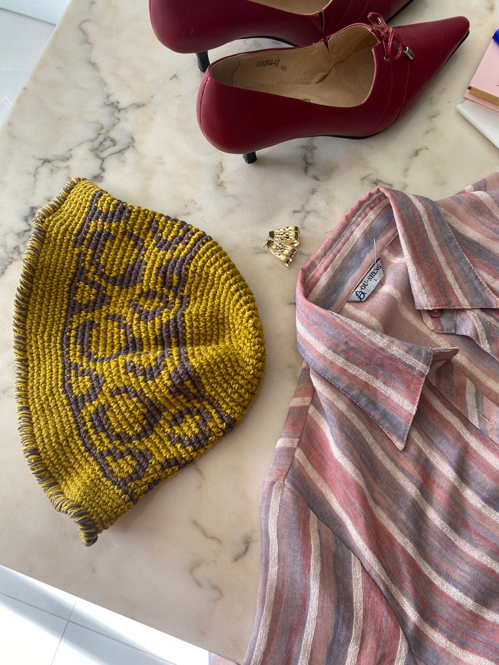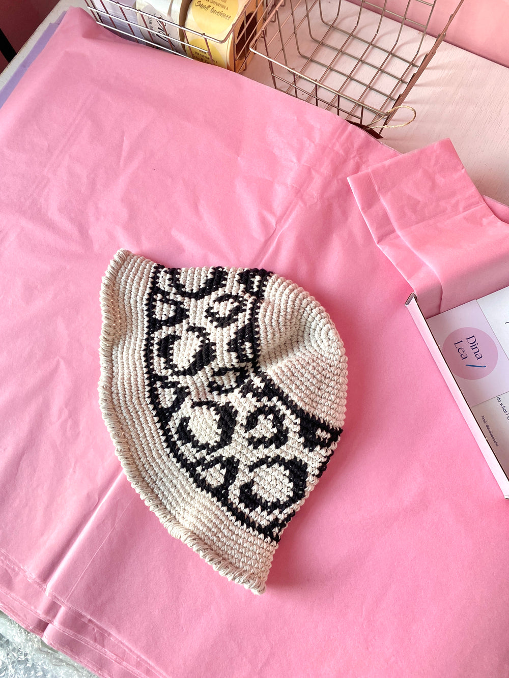 Opskrift på hæklet bøllehat med leopardprint. Opskriften er Dina Leas bøllehat design nr. 6.
