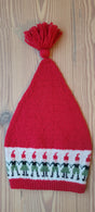 Nissehue i hønsestrik med motiver af nisser i mørke farver. Huen strikkes nedefra og op.