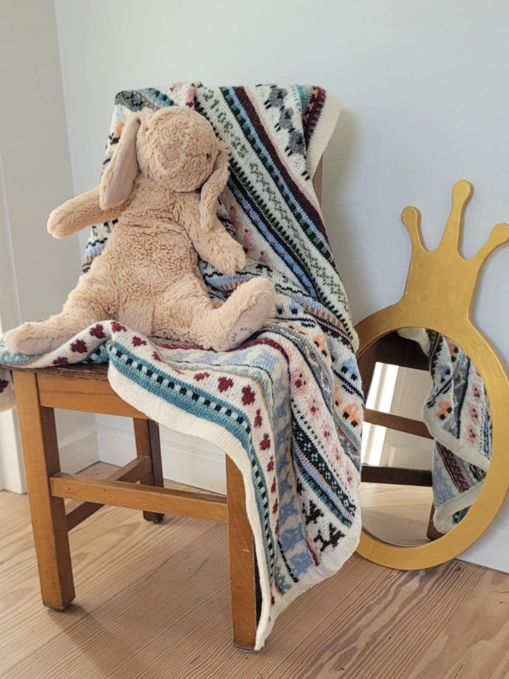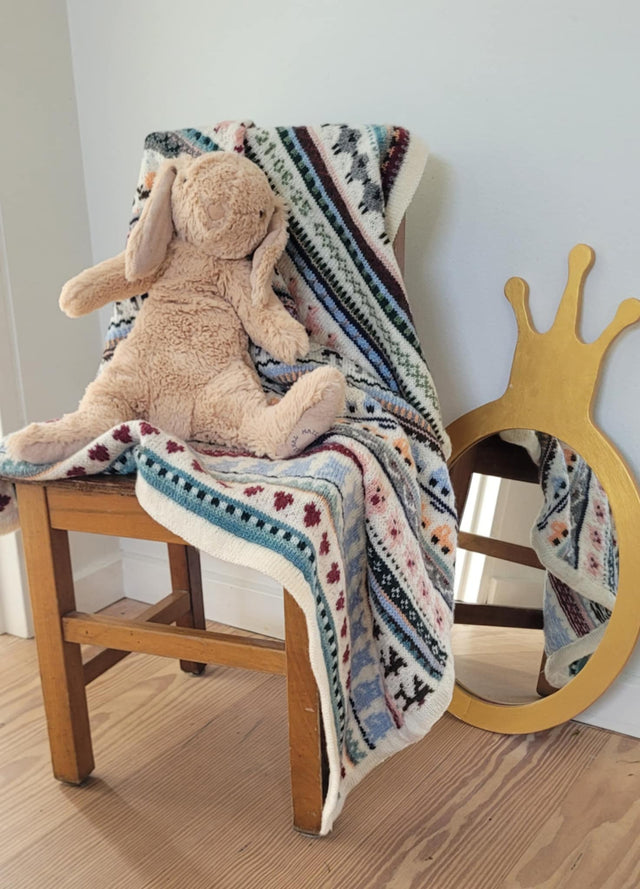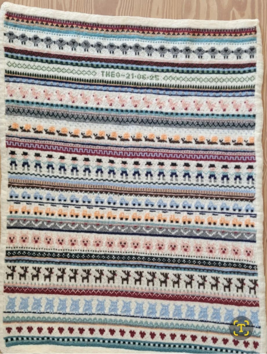 Theos tæppet er et hønsestrikket babytæppe med en masse forskellige motiver, ligesom du kan lade barnets navn og fødselsdato indgå i tæppet. Tæppet måler ca. 70 x 90 cm