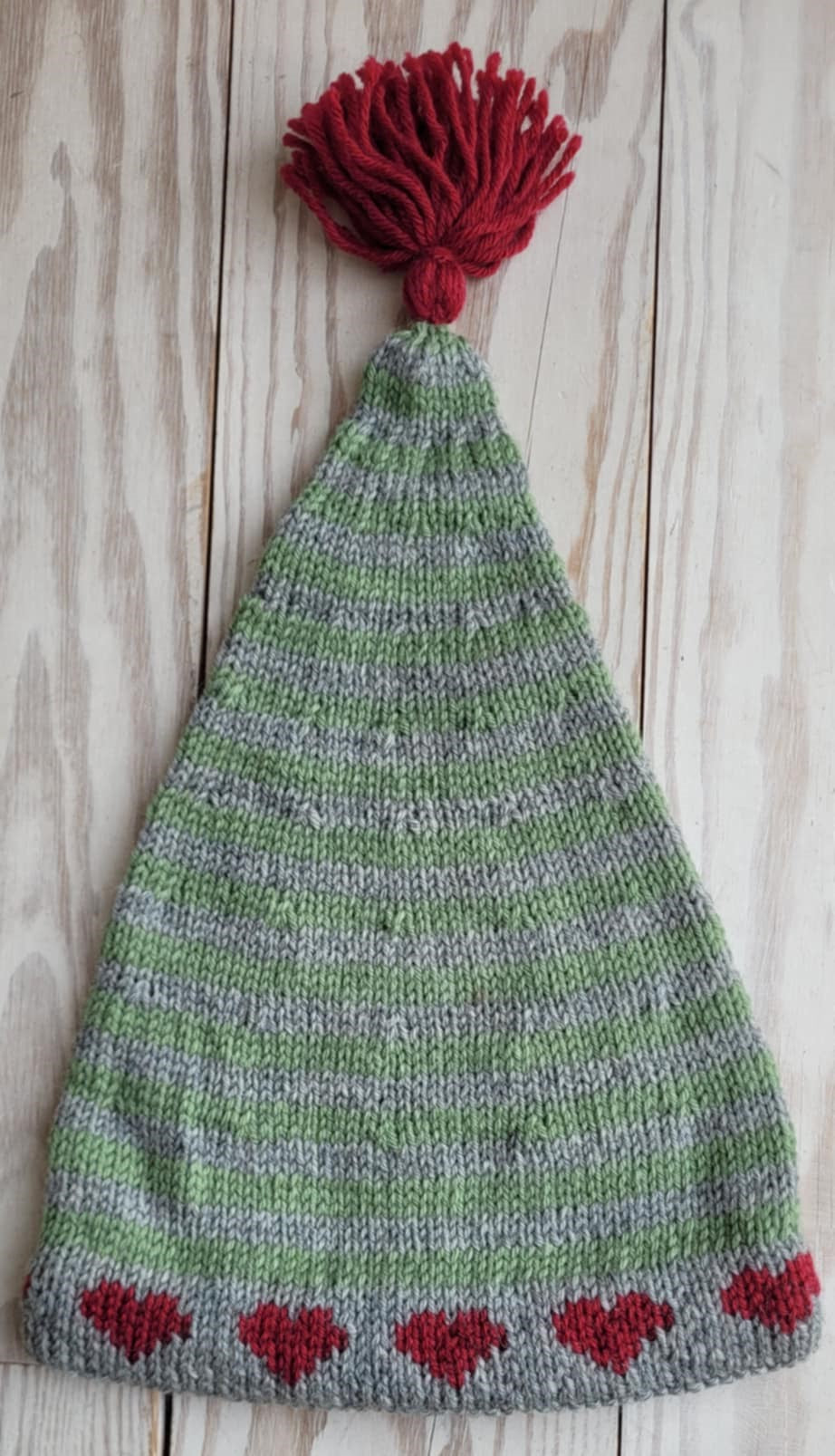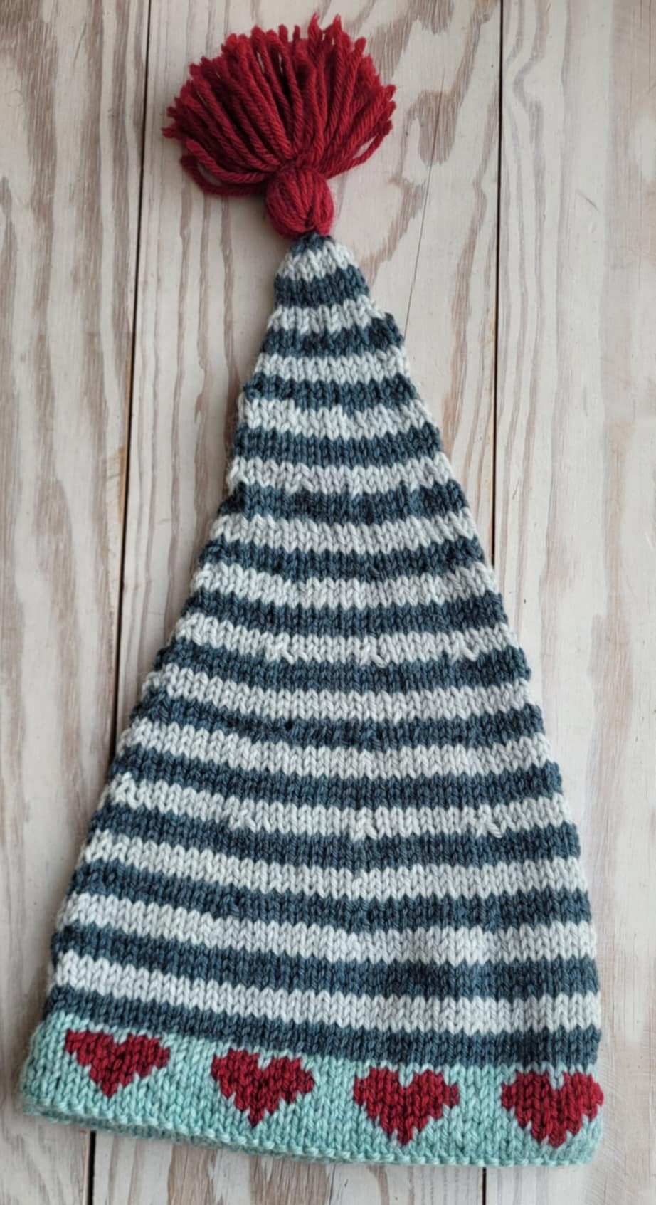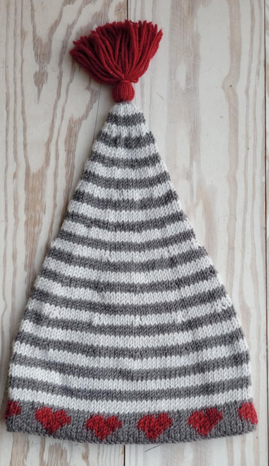 LF18 - Stribet nissehue med hjerterbort Opskrift - PDF er restordret og afsendes så snart det er tilbage på lager.