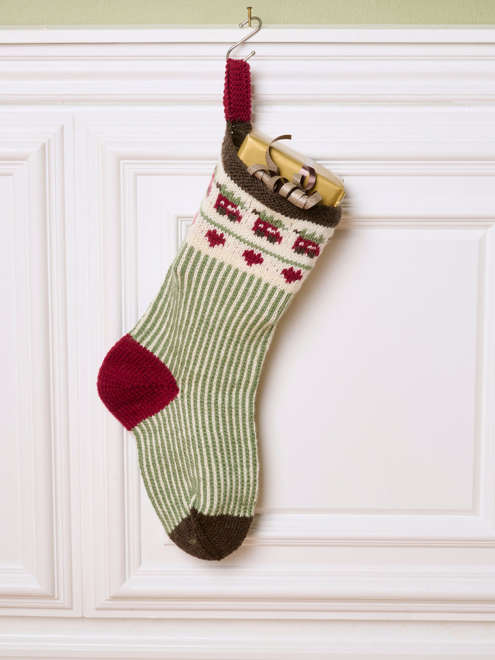 Stor julesok i røde og grønne farver. Sokken har et motiv af en bil med et juletræ på taget. Julesokken måler ca. 17 x 47 cm.
