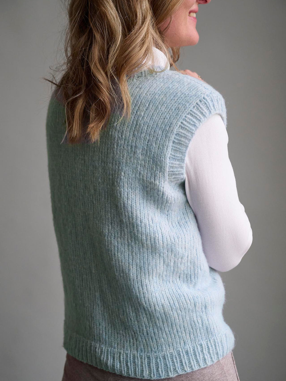 Vesten kan også strikkes i Mayflower Easy Care Classic sammen med en følgetråd af Mayflower Super Kid Silk Print. Find opskriften lige her.