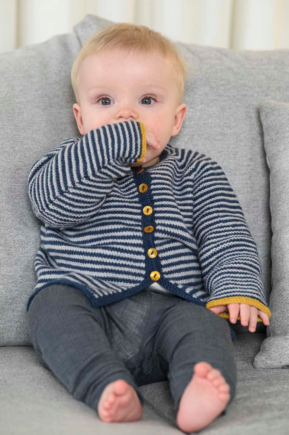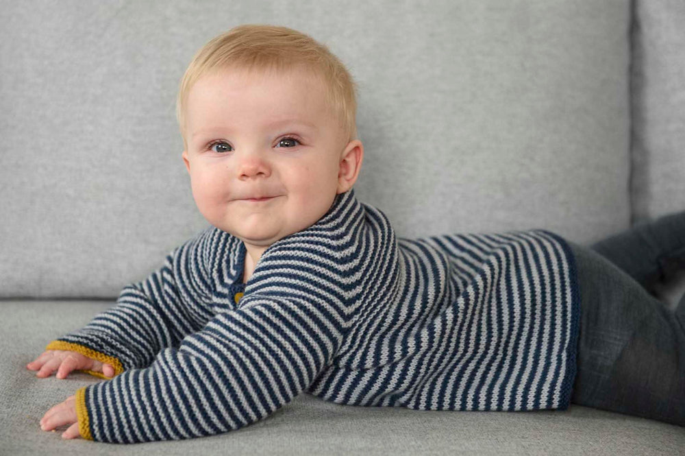 Sød cardigan til børn i alderen fra 0-4 år. Cardiganen har et enkelt design med smalle striber og knapper, som ikke går hele vejen ned.