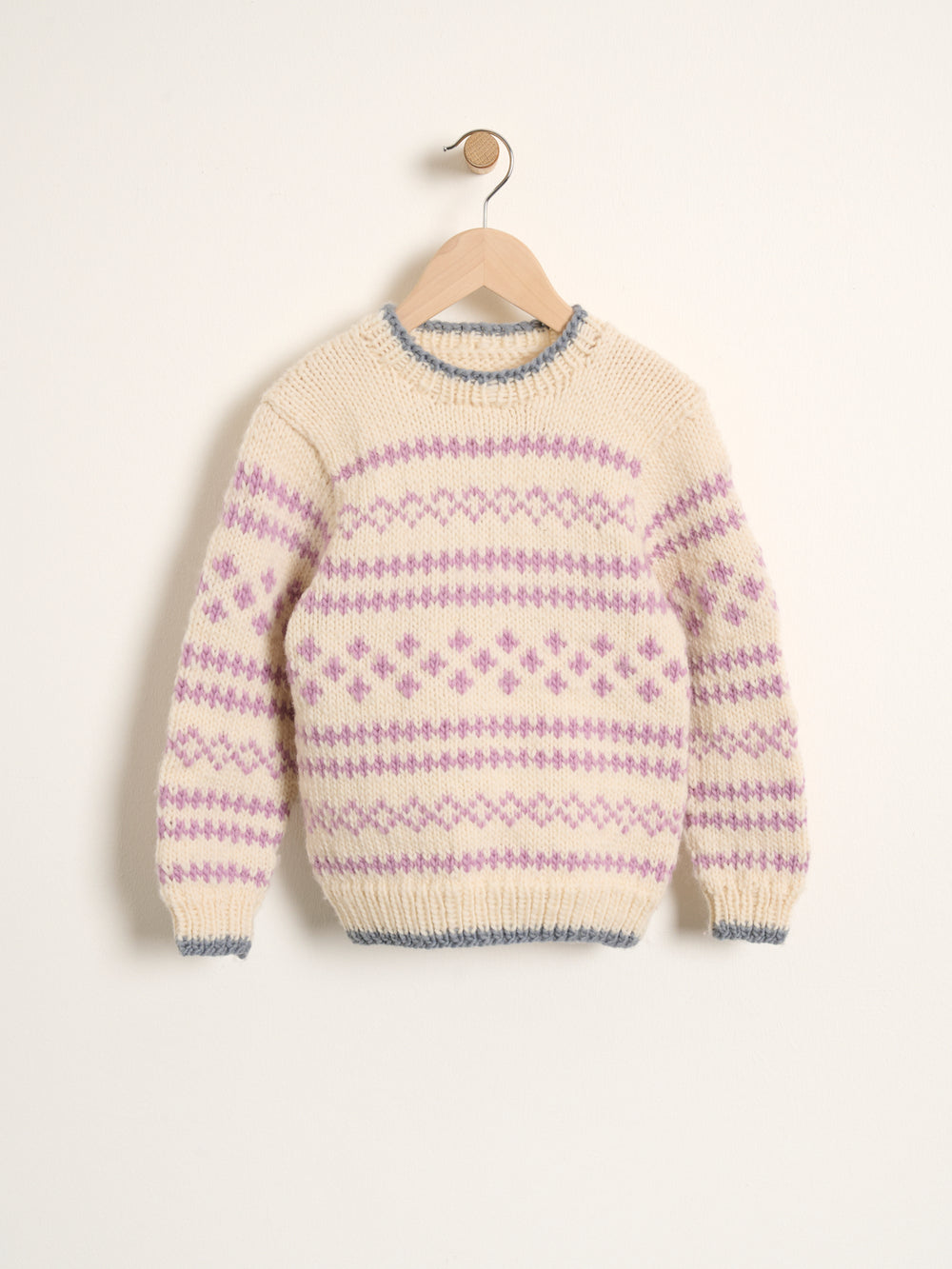 Med tre forskellige farver i sweateren er der gode muligheder for at lege med farven og sweaterens udtryk. Én mulighed er for eksempel at vælge to dæmpede farver til sweaterens mønster og til gengæld give den gas med en vild kontrastfarve i sweaterens kanter.